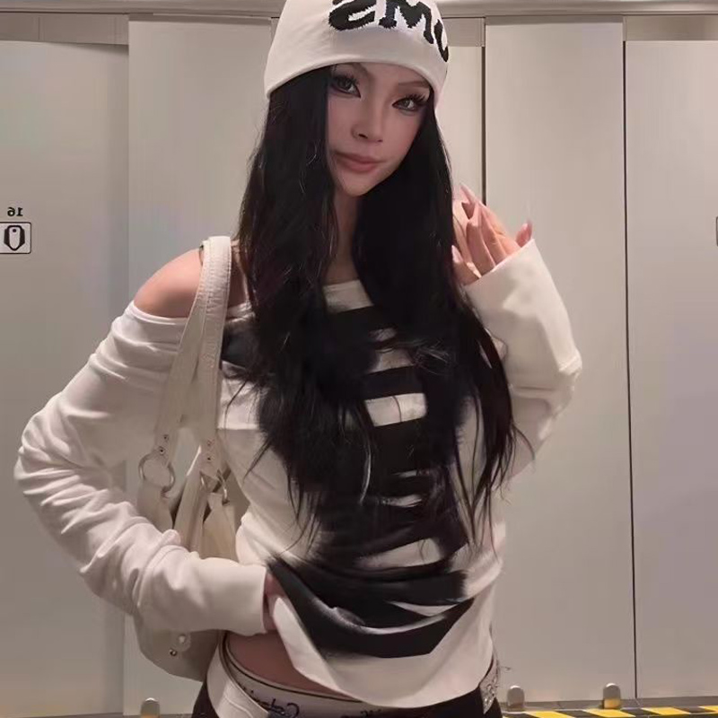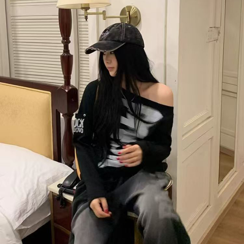 YF7066-图片色港式露肩字母印花慵懒风辣妹时尚薄款设计感大码卫衣