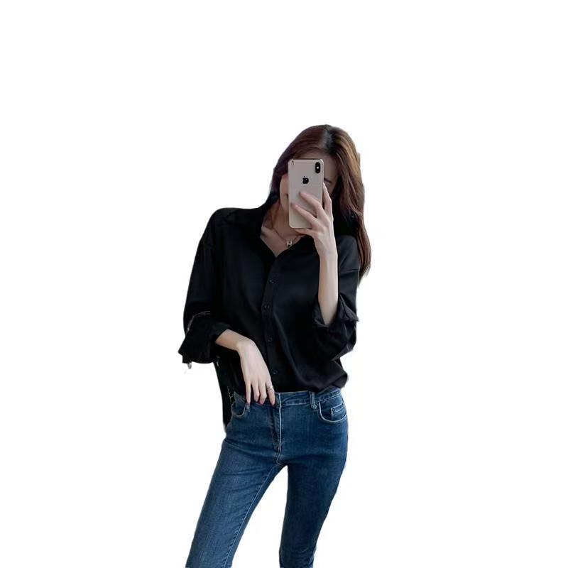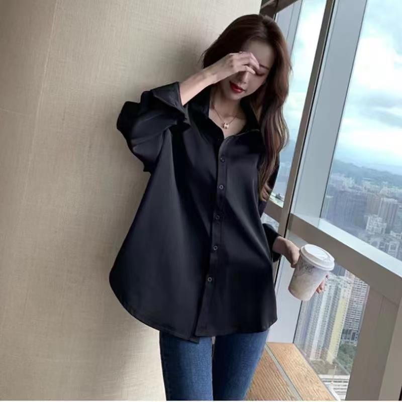 YF7077-图片色轻奢感春季新款POLO领长袖宽松显瘦纯色胖MM显瘦雪纺衫