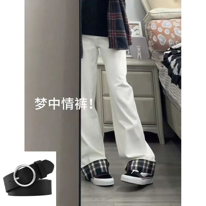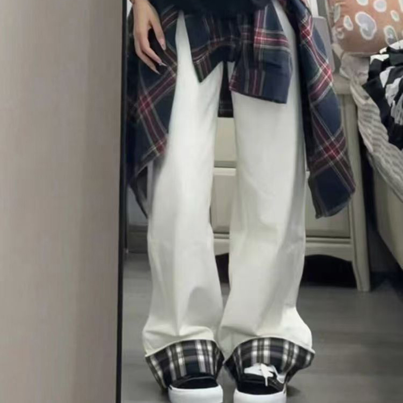 YF7078-图片色韩版时尚复古格子卷边系扣高腰直筒白色高雅气质牛仔裤