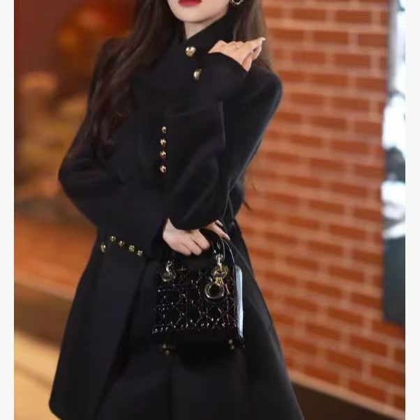 YF7079-图片色高级感冬季长袖双排扣高领系腰带中长款宽松毛呢大衣外套