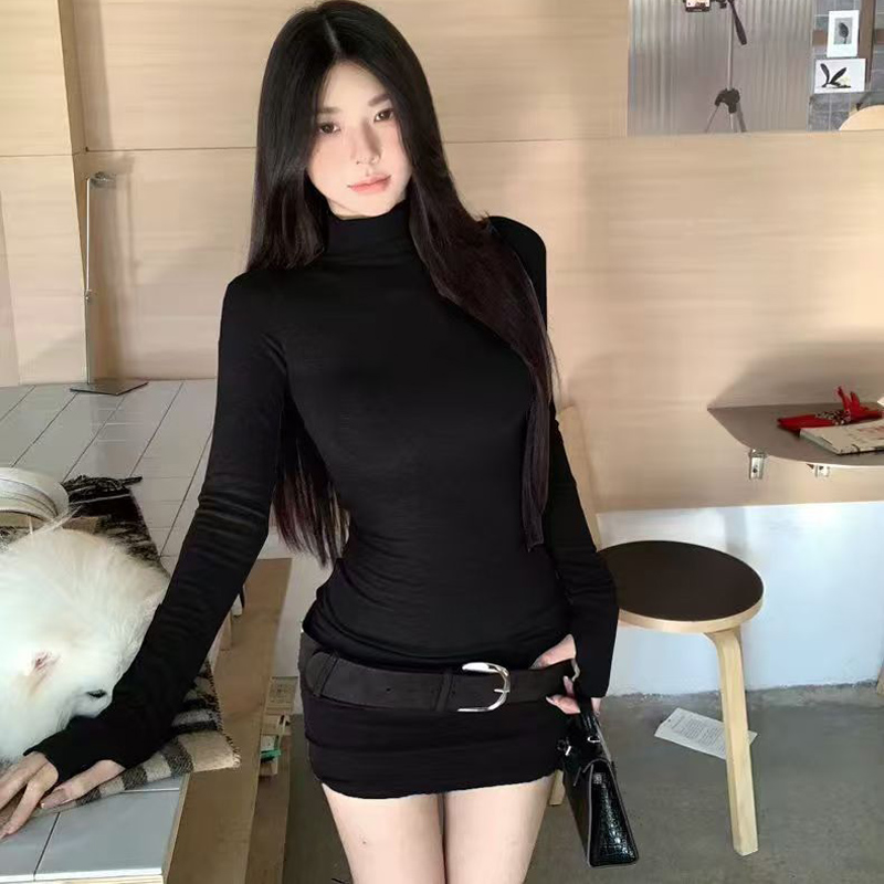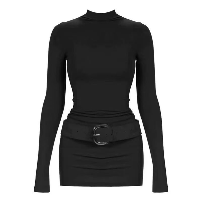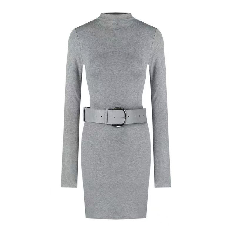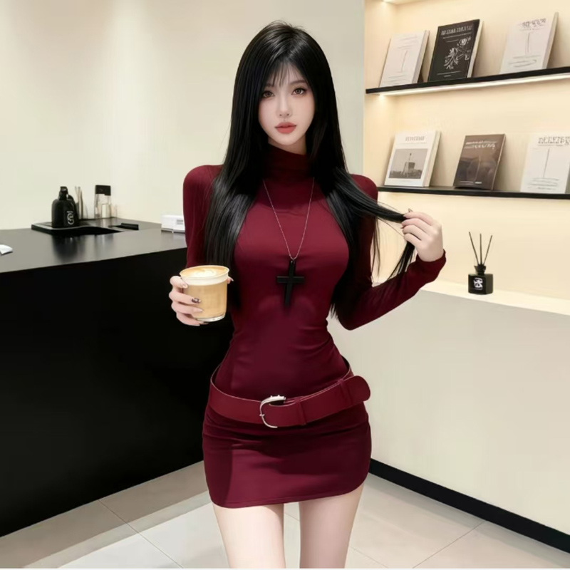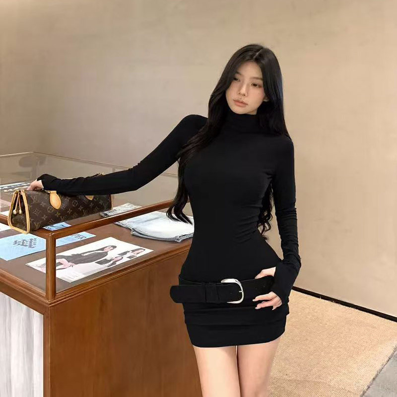 YF7082-(3色入内)时尚春秋磨毛半高领长袖弹力修腰包臀系腰潮流连衣打底裙
