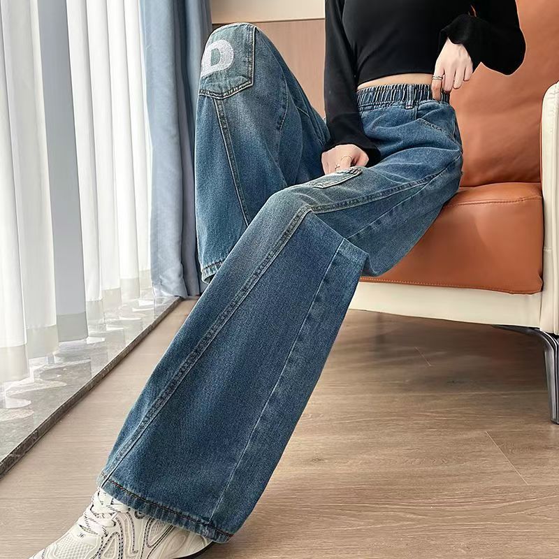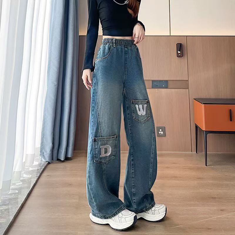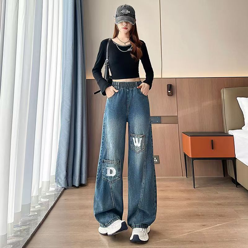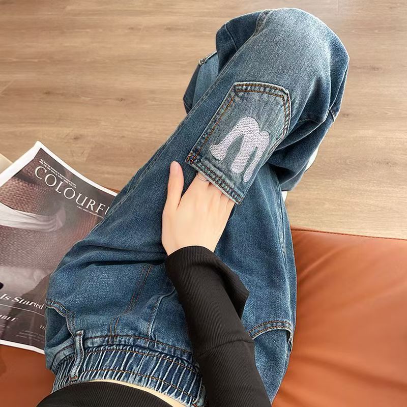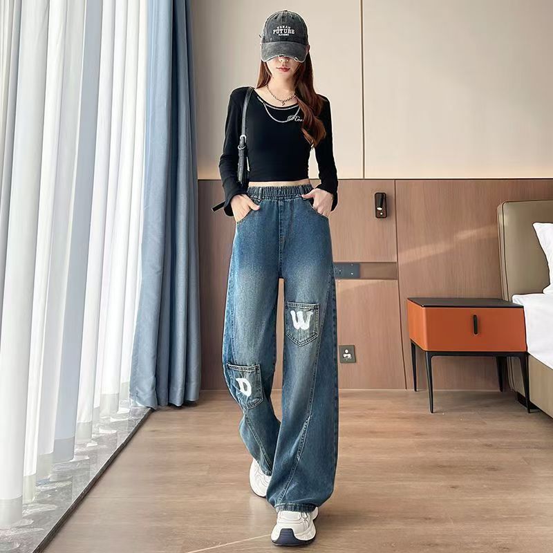 YF7087-图片色港式时尚开叉拼接设计DW字母刺绣松紧腰直筒坠地感牛仔裤