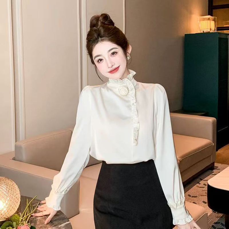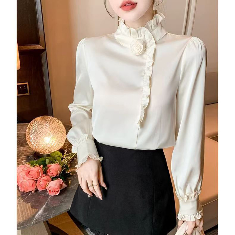 YF7089-图片色甜美时尚立体玫瑰花荷叶边小众新款长袖立领宽松春秋上衣