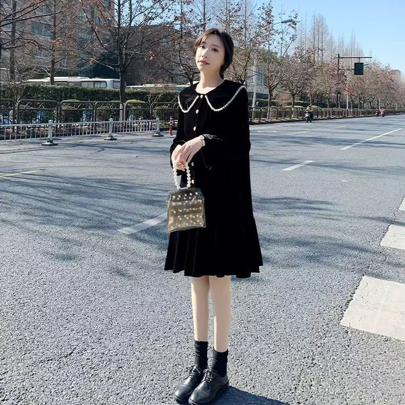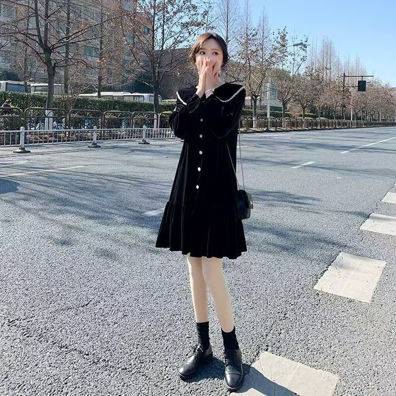 YF7090-图片色甜美韩版娃娃领长袖排扣赫本风拼接金丝绒宽松显瘦连衣裙