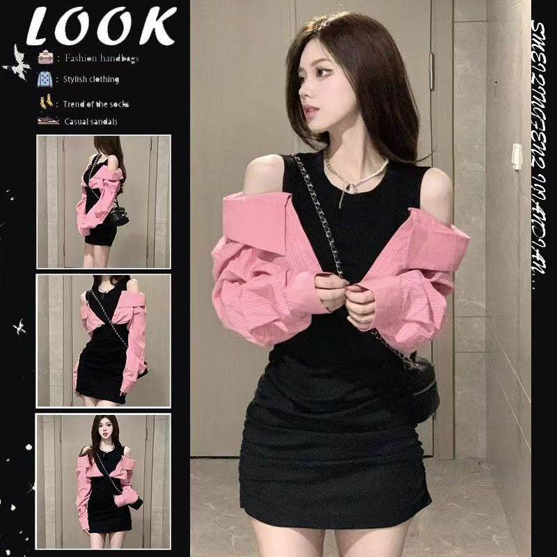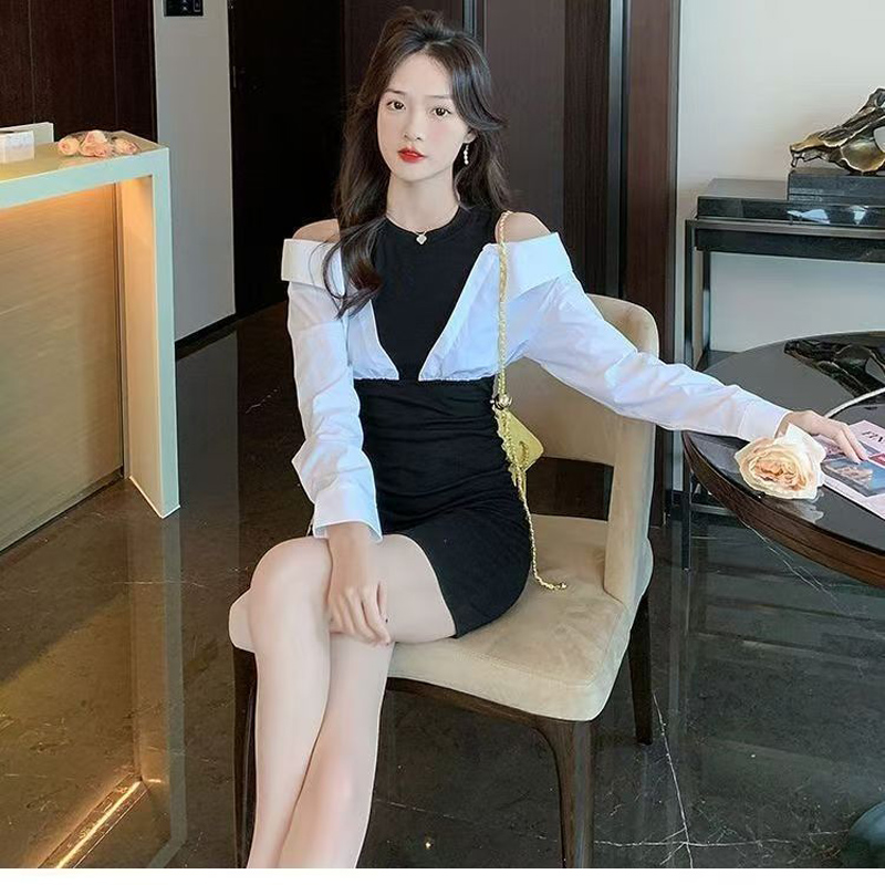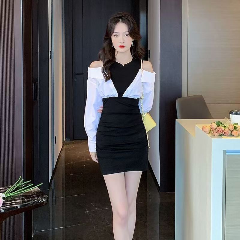 YF7091-(2色入内)纯欲风镂空长袖拼接弹力修腰包臀辣妹设计假两件连衣裙