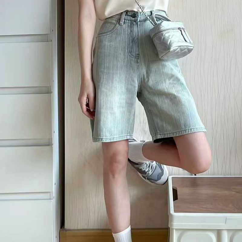 YF7093-图片色时尚夏季港式系扣高腰直筒开叉五分竹节纹浅蓝设计牛仔裤