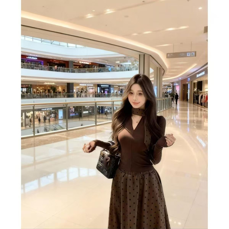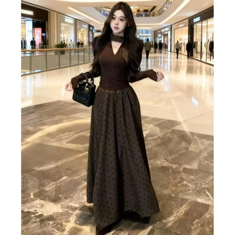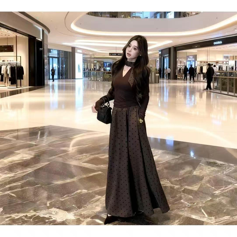 YF7094-图片色两件套镂空长袖高腰弹力贴身V领上衣搭松紧腰直筒阔腿长裙套装