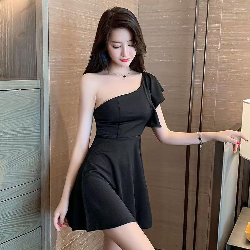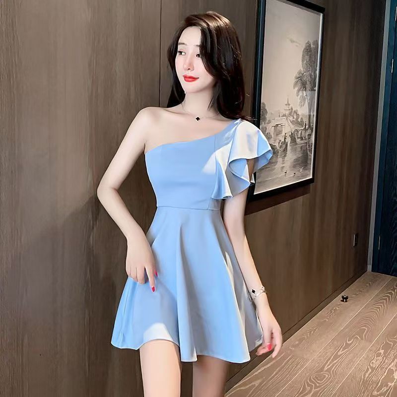 YF7095-(2色入内)纯欲风荷叶边露肩收腰显瘦辣妹设计感纯色抹胸连衣裙