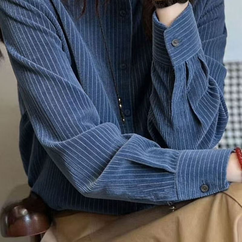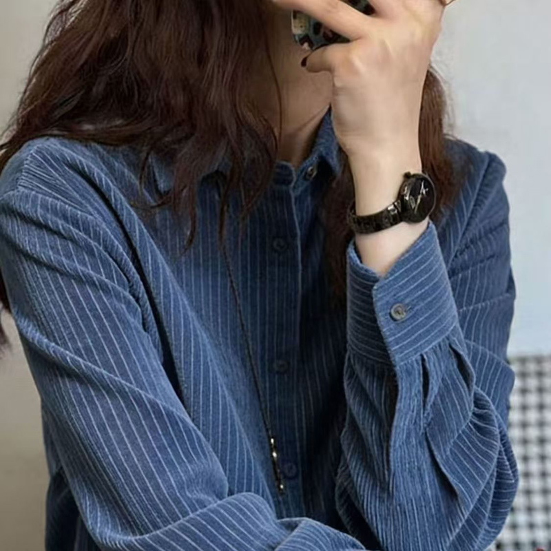 YF7096-图片色春季韩版长袖翻领系扣经典蓝暗纹高级感OL气质条纹衬衣