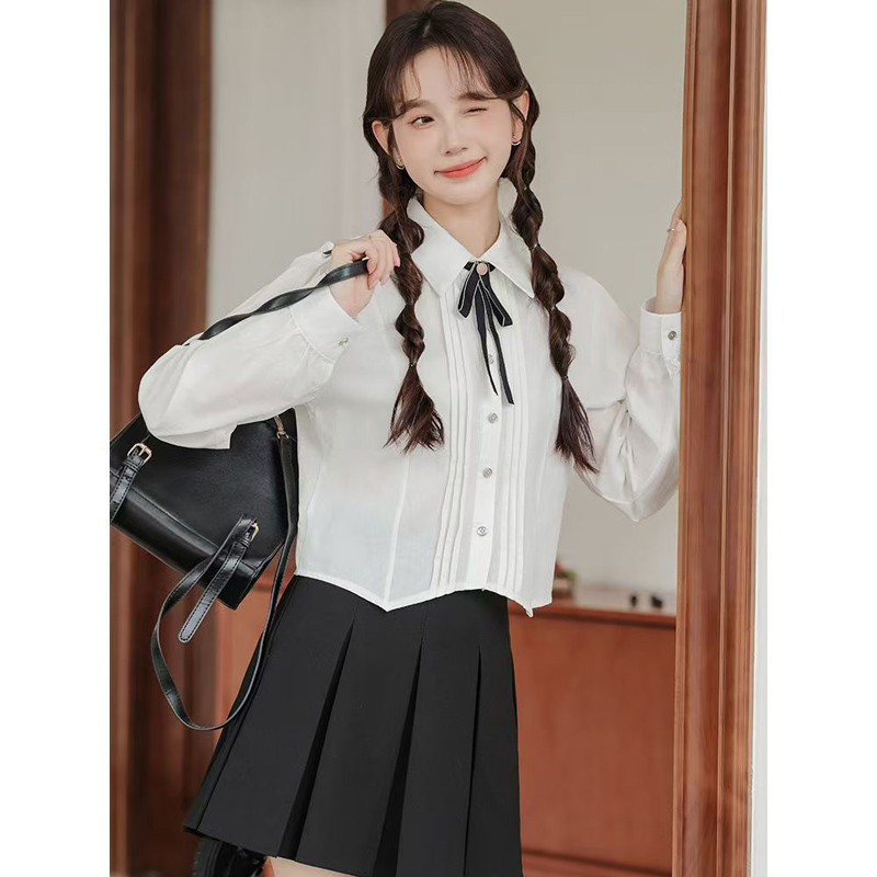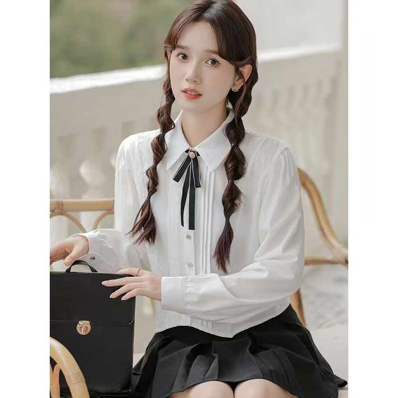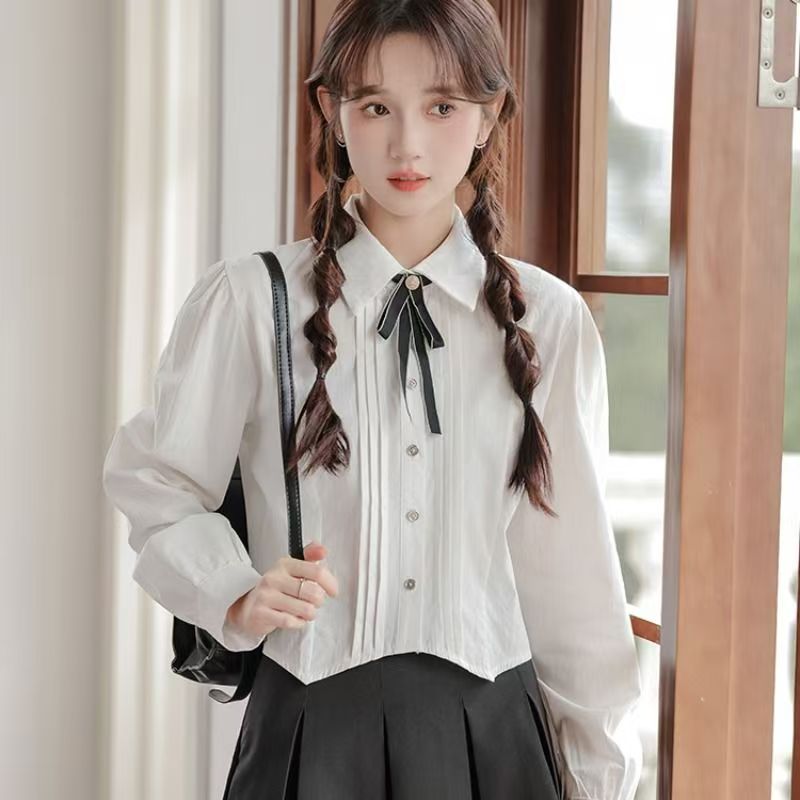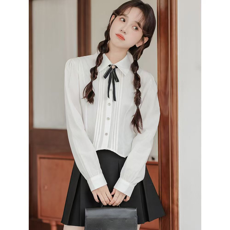 YF7097-图片色甜美时尚长袖翻领系蝴蝶结褶折系扣褶折感短装打底衬衫