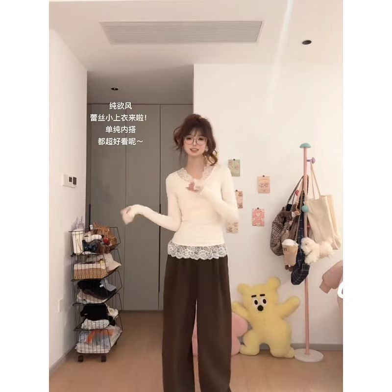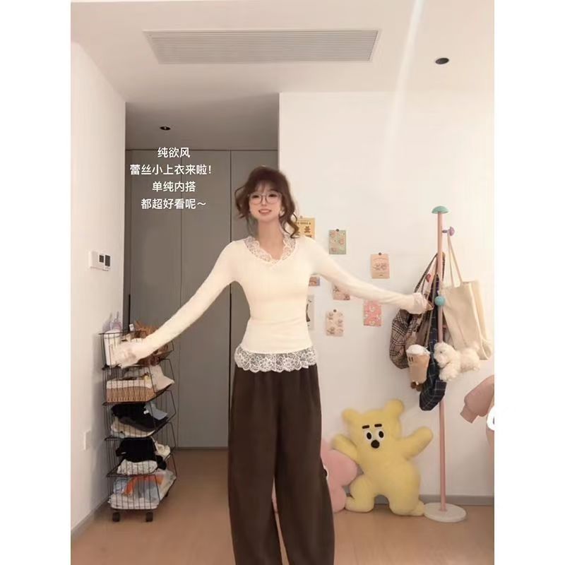 YF7098-图片色春秋纯欲风蕾丝花边圆领蝴蝶结弹力收腰显瘦百搭打底衫