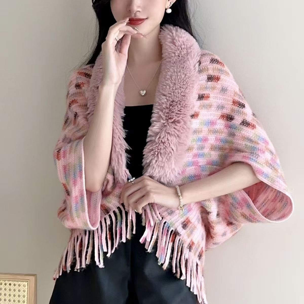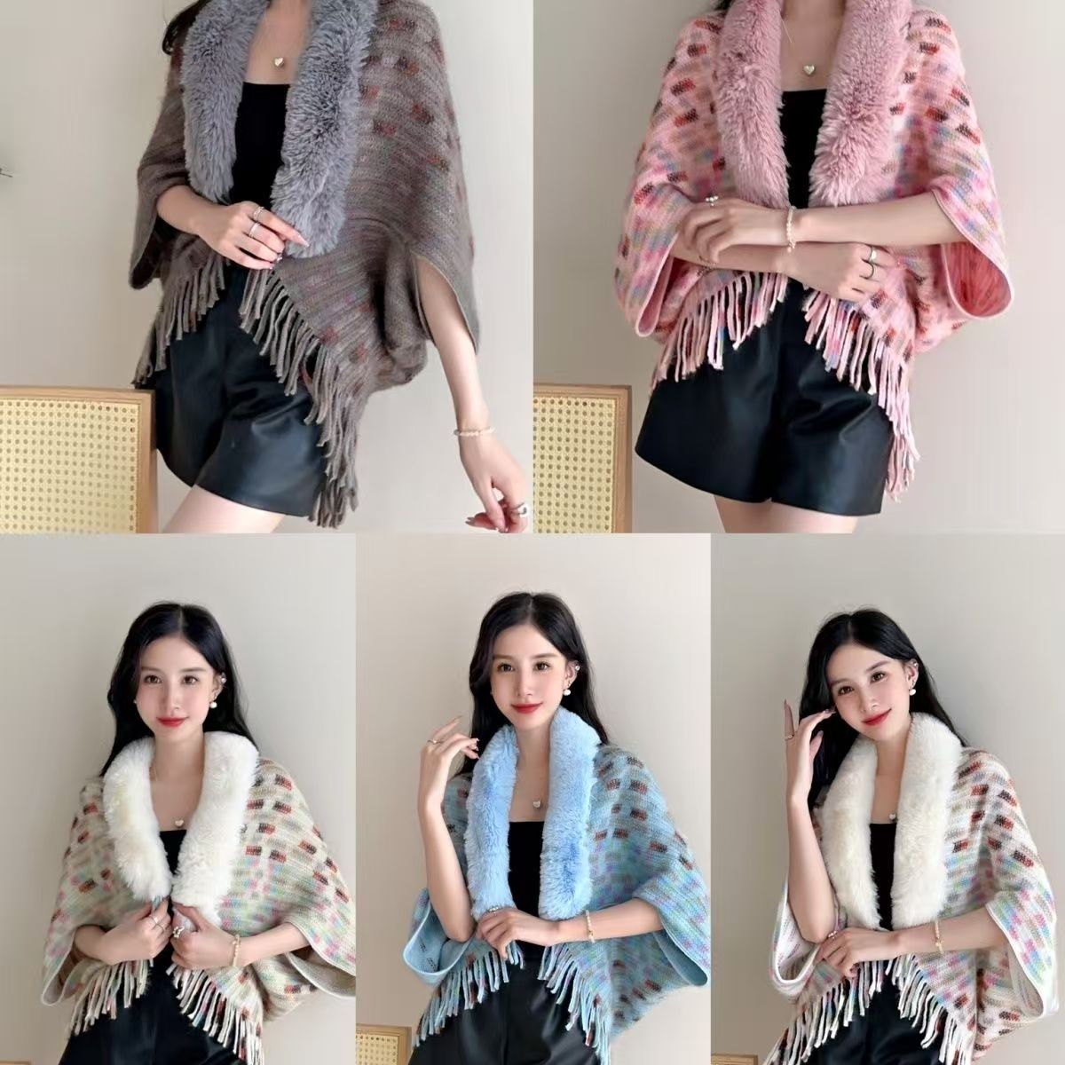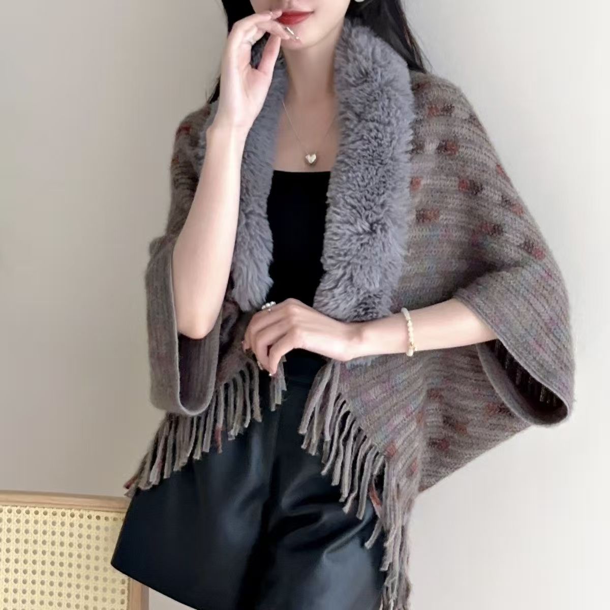 YF7100-(4色入内)冬季名媛风斑点纹毛毛围脖流苏民族风复古针织斗蓬外套
