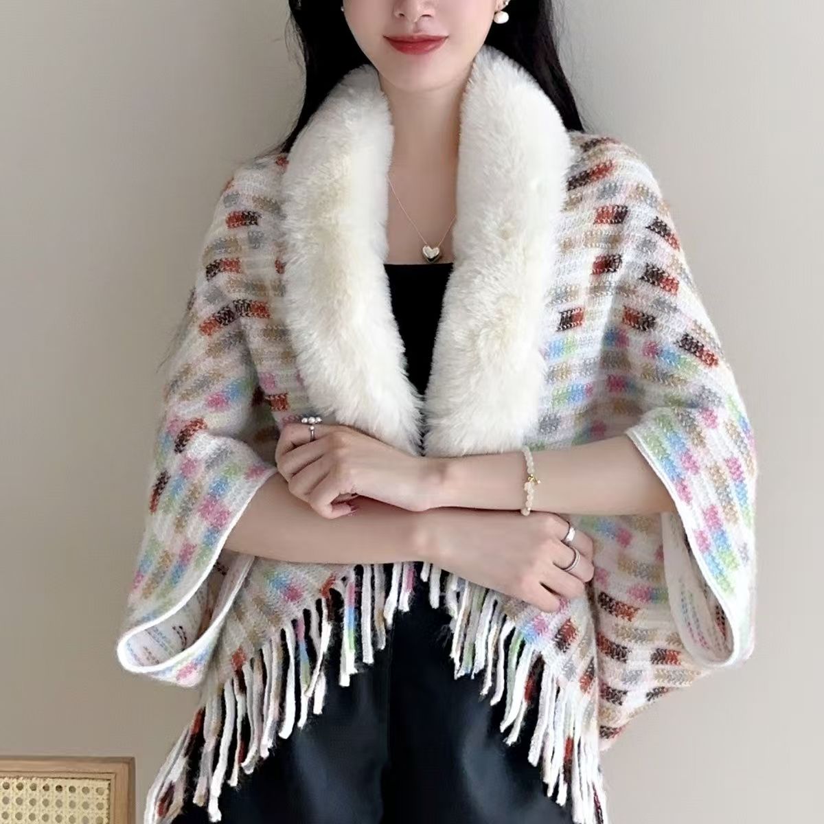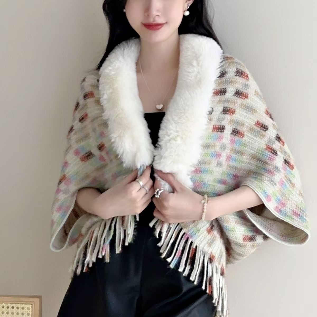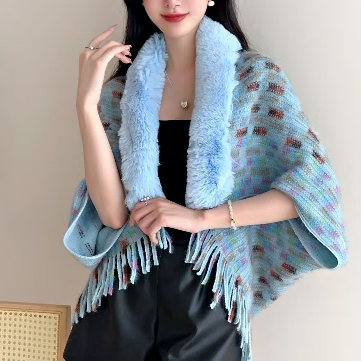 YF7100-(4色入内)冬季名媛风斑点纹毛毛围脖流苏民族风复古针织斗蓬外套