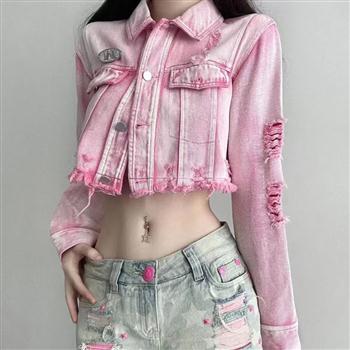 YF7102-图片色韩版露脐短装字母刺绣长袖翻领流苏粉色设计牛仔夹克上衣