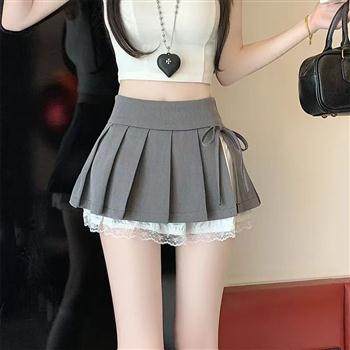 YF7104-(3色入内)甜美时尚原宿风收腹高腰蝴蝶结蕾丝拼接有内衬百褶短裙
