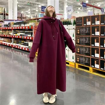 YF7105-图片色慵懒风落肩袖连帽抽绳胖MM显瘦宽松大码休闲卫衣连衣裙
