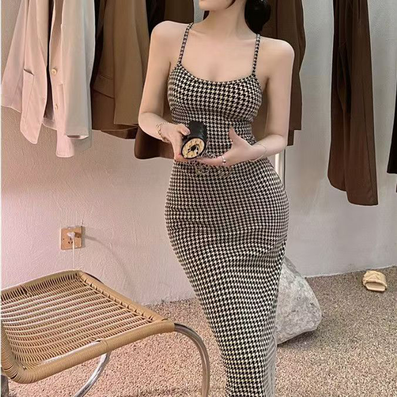 YF7107-图片色性感辣妹春夏后背梆带镂空收腰开叉千鸟格无袖包臀连衣裙