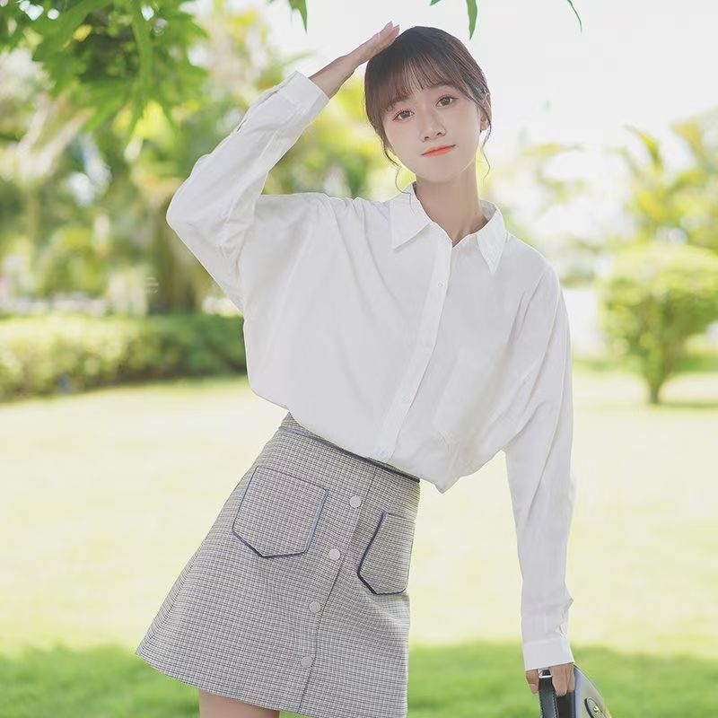 YF7108-图片色白色百搭简约风落肩袖翻领宽松显瘦大码春季时尚气质上衣