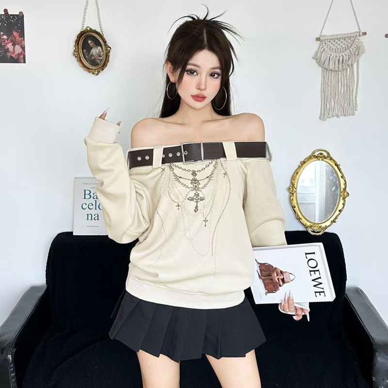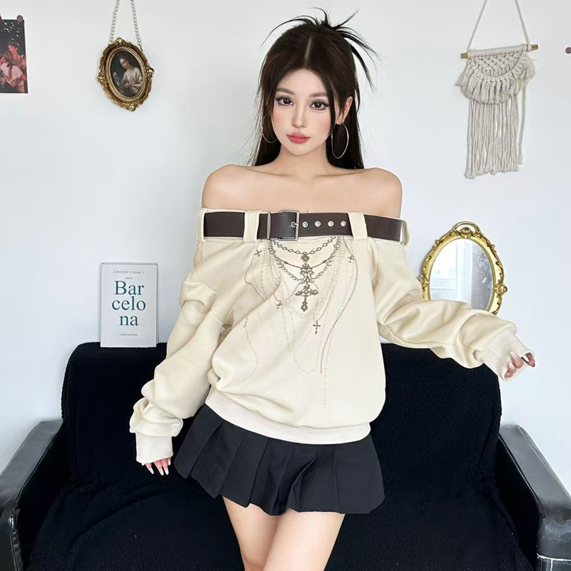 YF7110-图片色港式一字肩个性设计系腰带束肩宽松显瘦加大码上衣潮