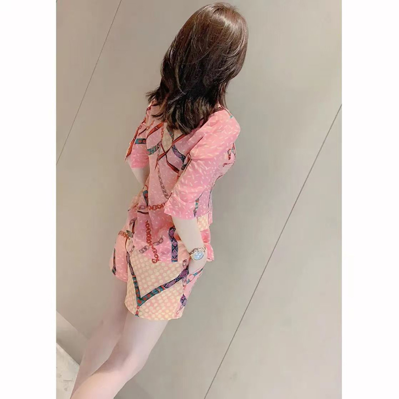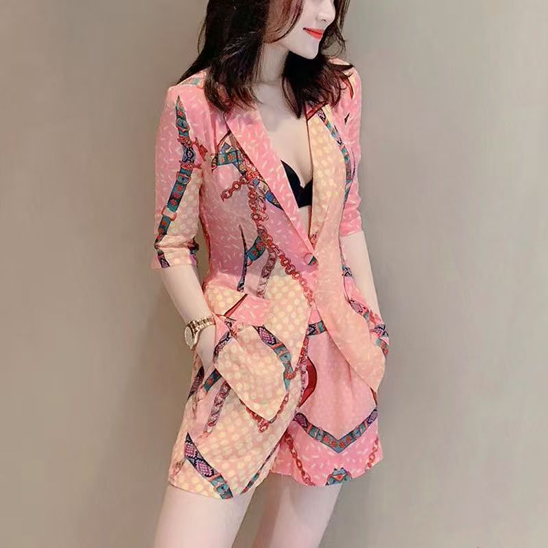 YF7114-图片色两件套夏季洋气印花短袖西装领系扣修身上衣搭高腰短裤套装