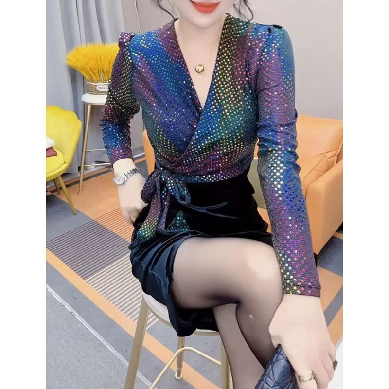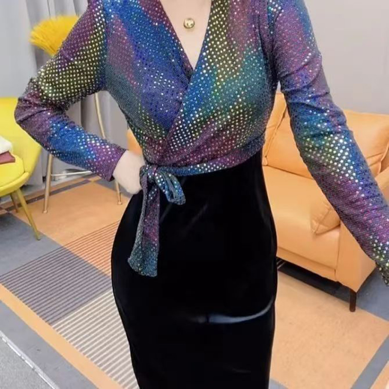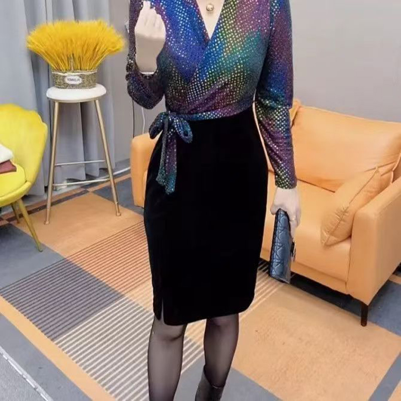YF7115-图片色春装闪闪亮片拼接假两件绑带系腰名媛别致连衣裙