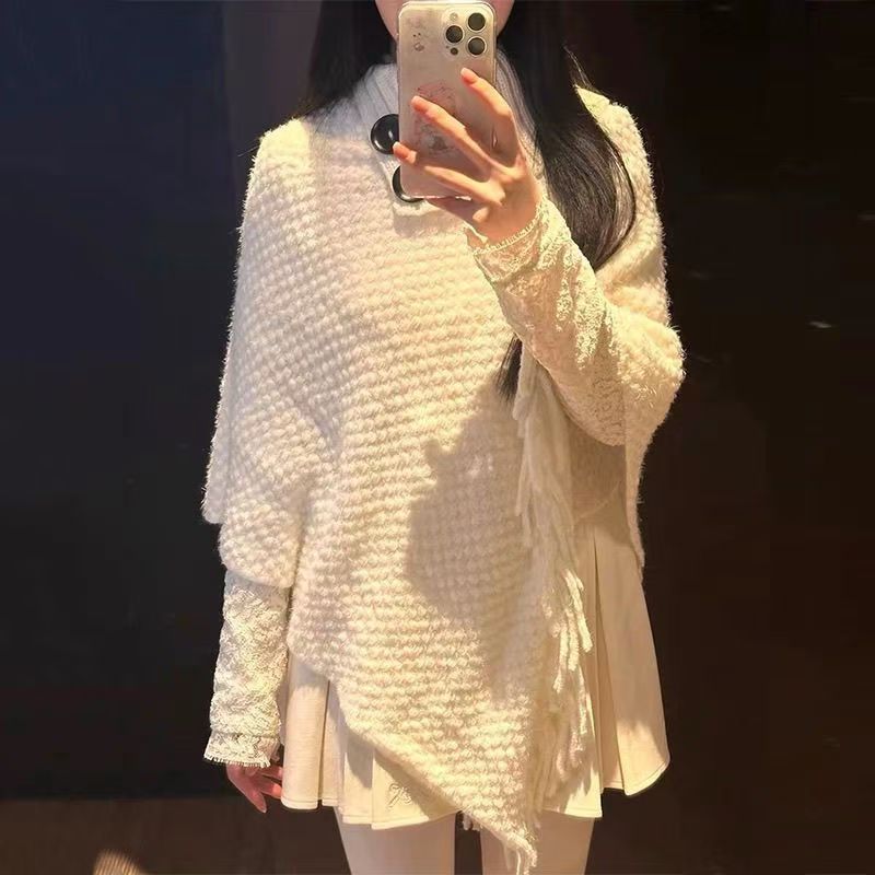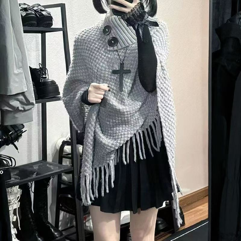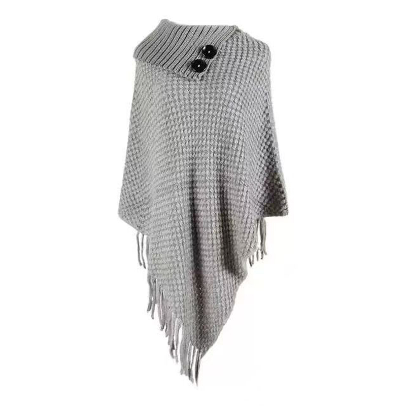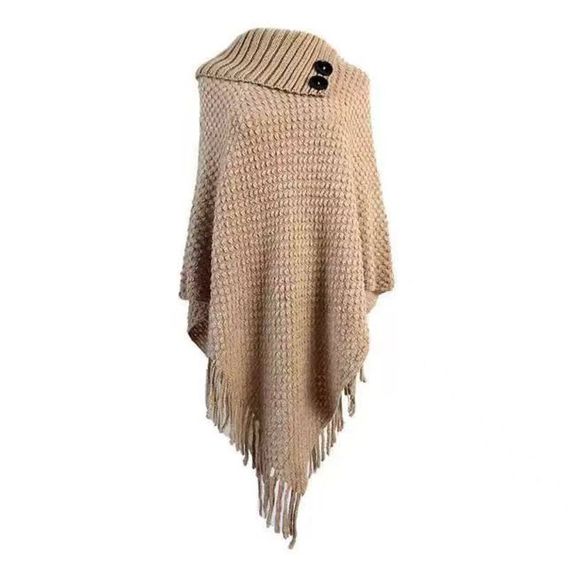 YF7116-(5色入内)韩版冬季系扣翻领肩连袖流苏不规则提花设计针织毛衣