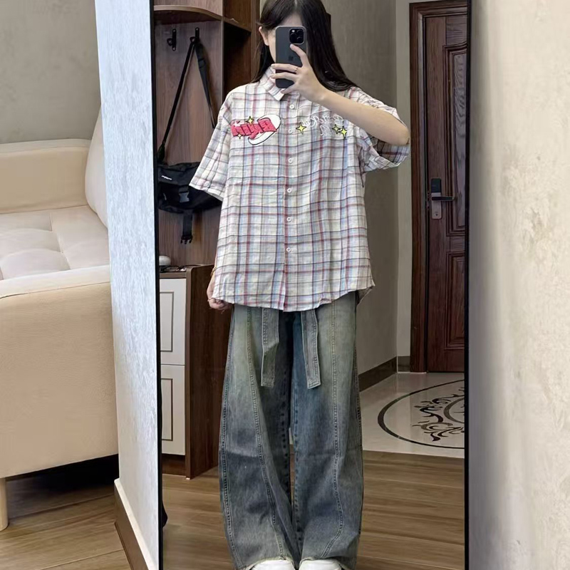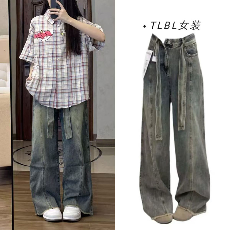 YF7117-图片色港式INS时尚绑带系腰直筒坠地感复古风阔腿显瘦牛仔裤
