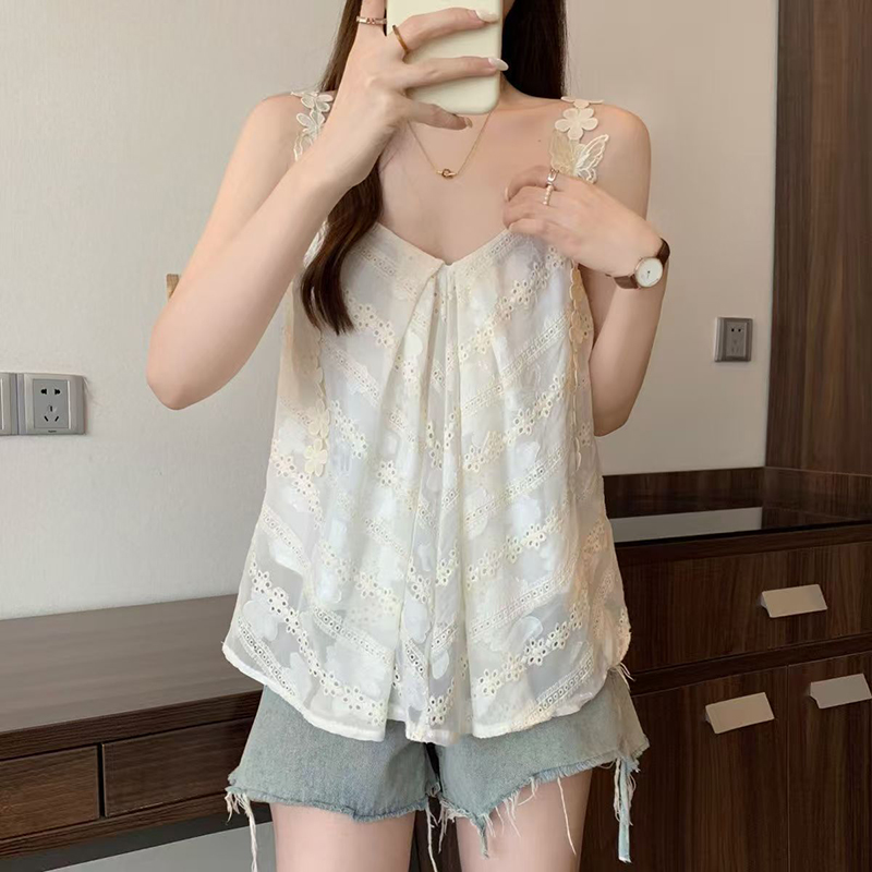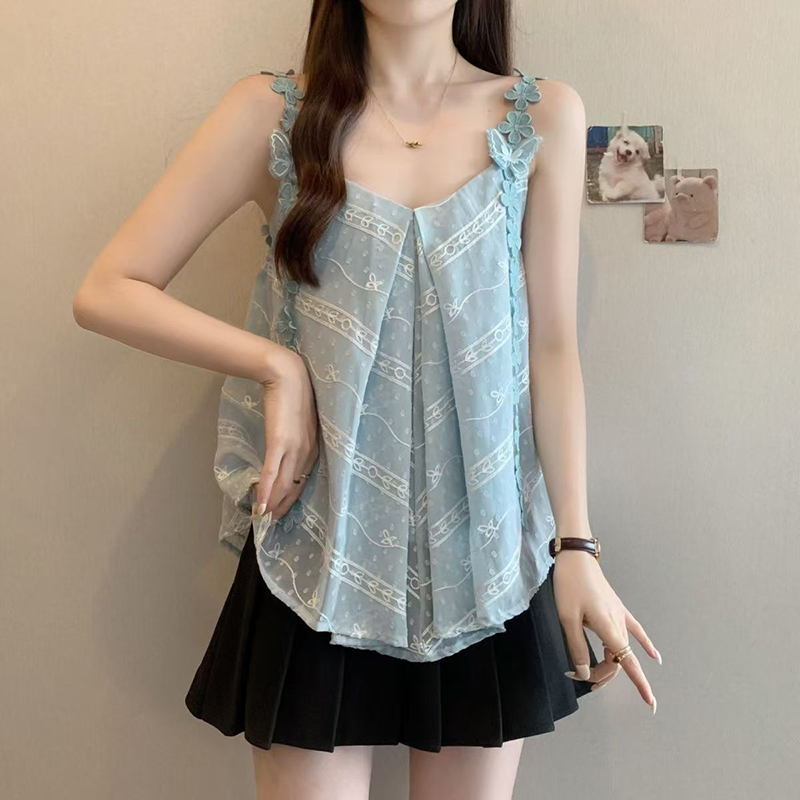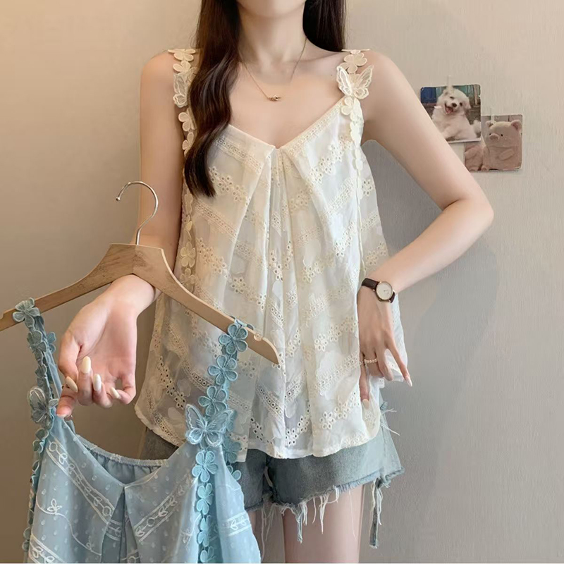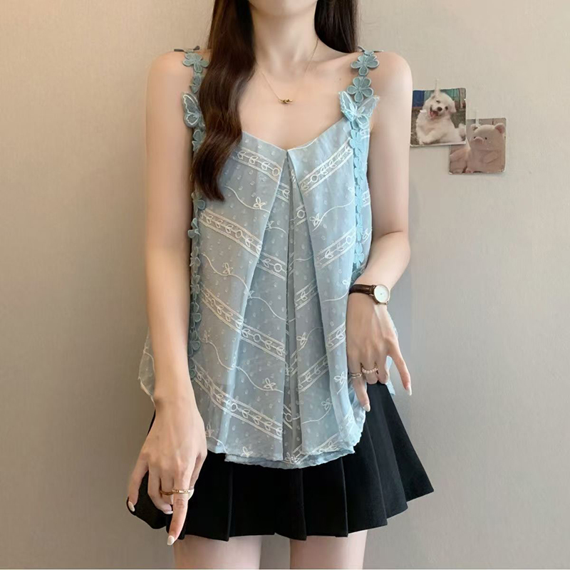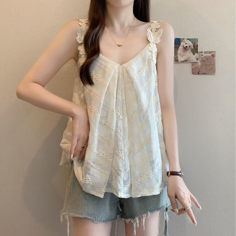 YF7127-(2色入内)不规则褶折蝴蝶结吊带A字夏天新款无袖性感蕾丝拼接背心