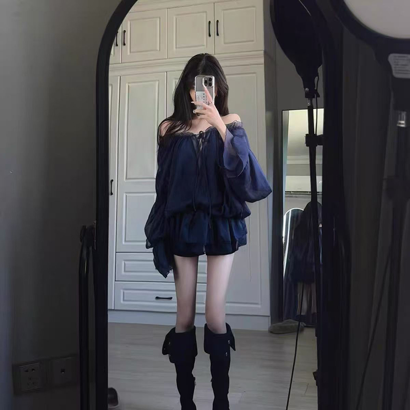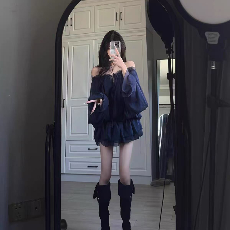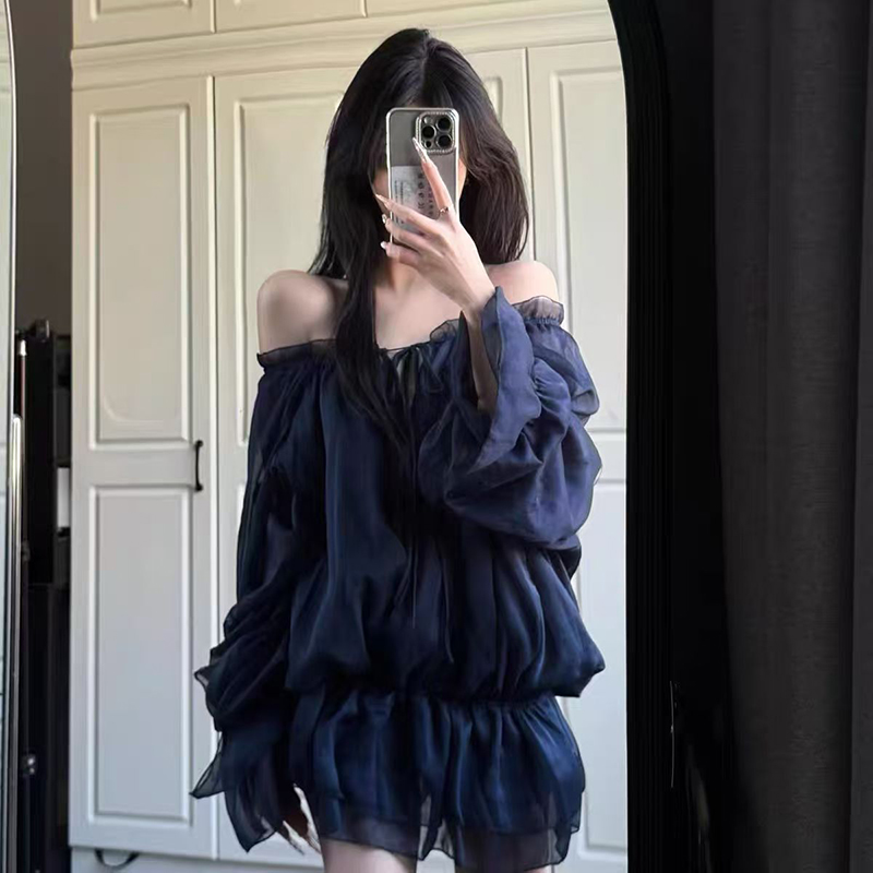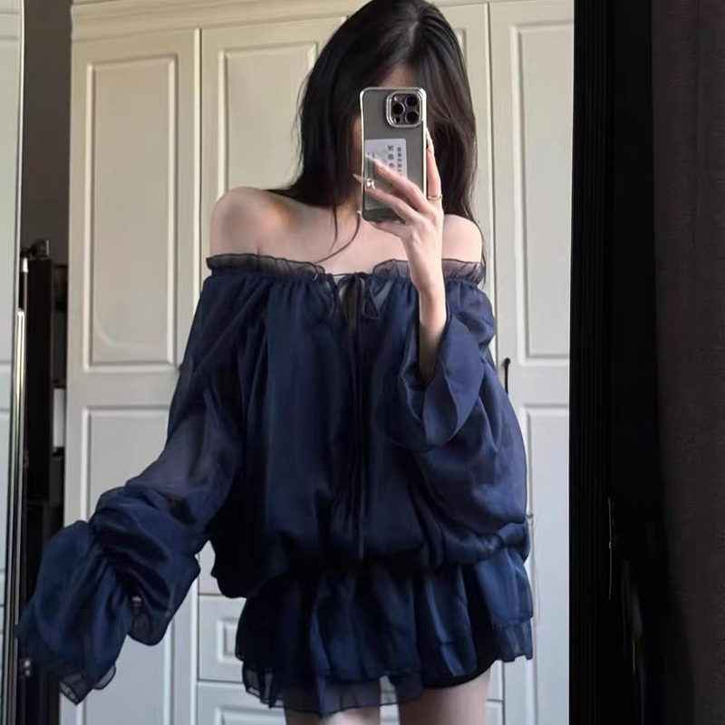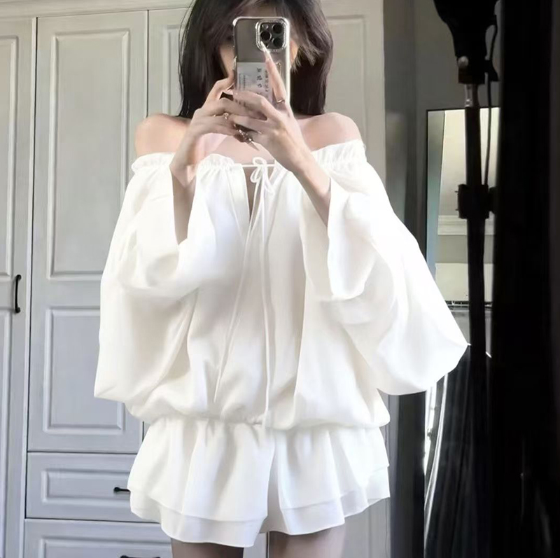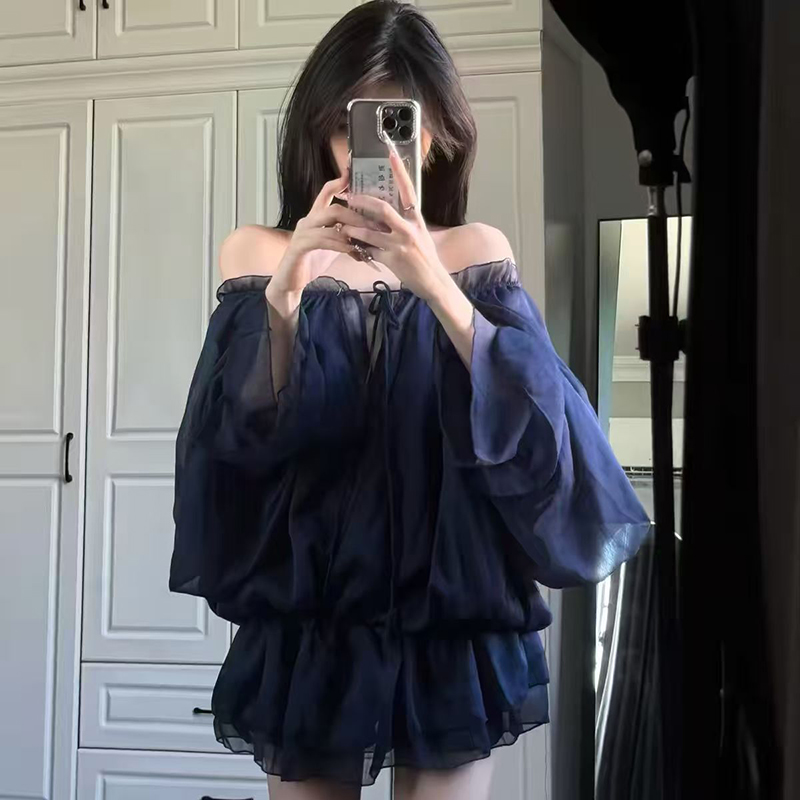YF7129-(2色入内)港式一字抹胸荷叶边弹力抽绳设计百褶感辣妹雪纺纯欲上衣