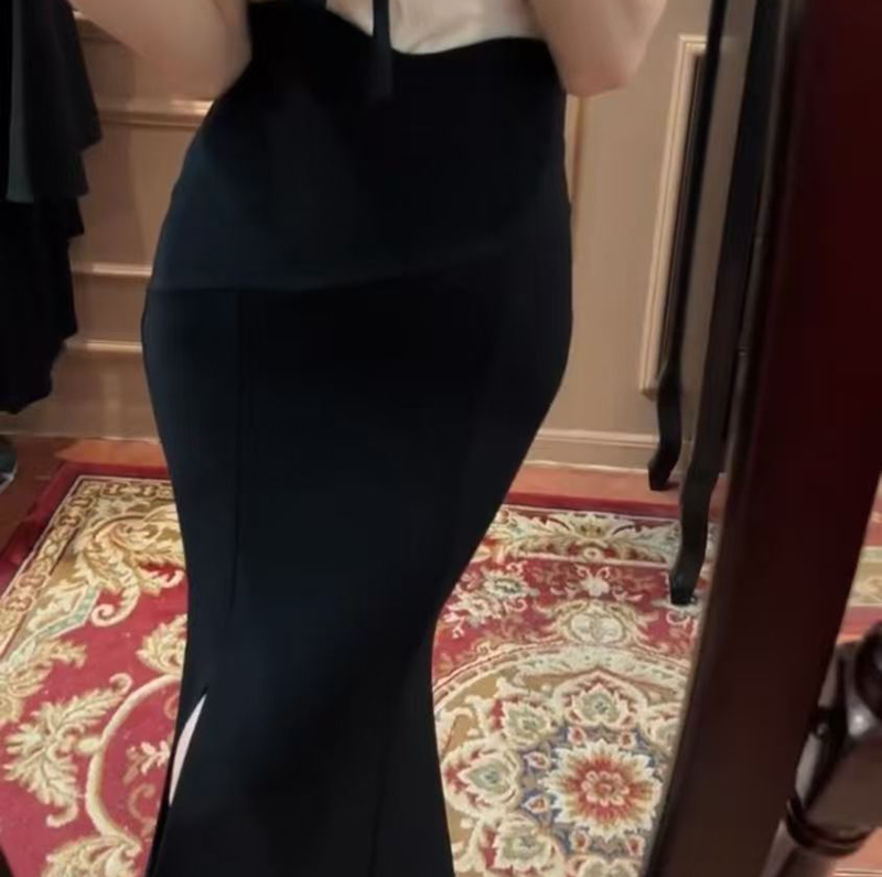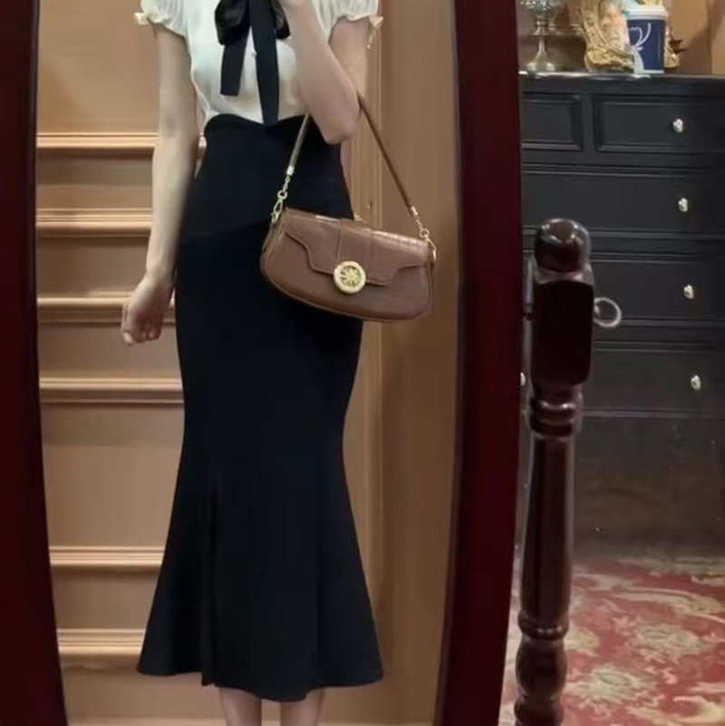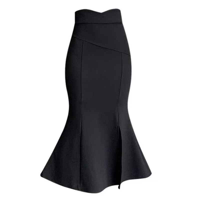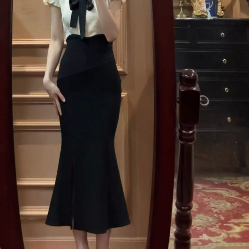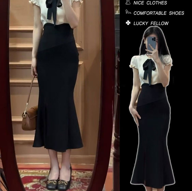 YF7133-图片色韩版优雅黑色夏季新款高腰包臀拼接开叉修腰显瘦鱼尾裙子
