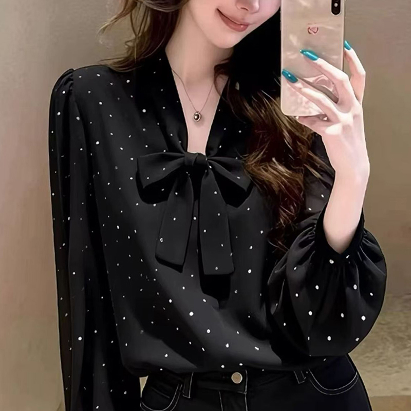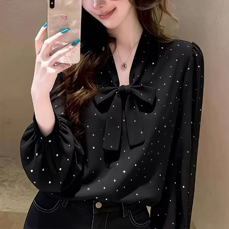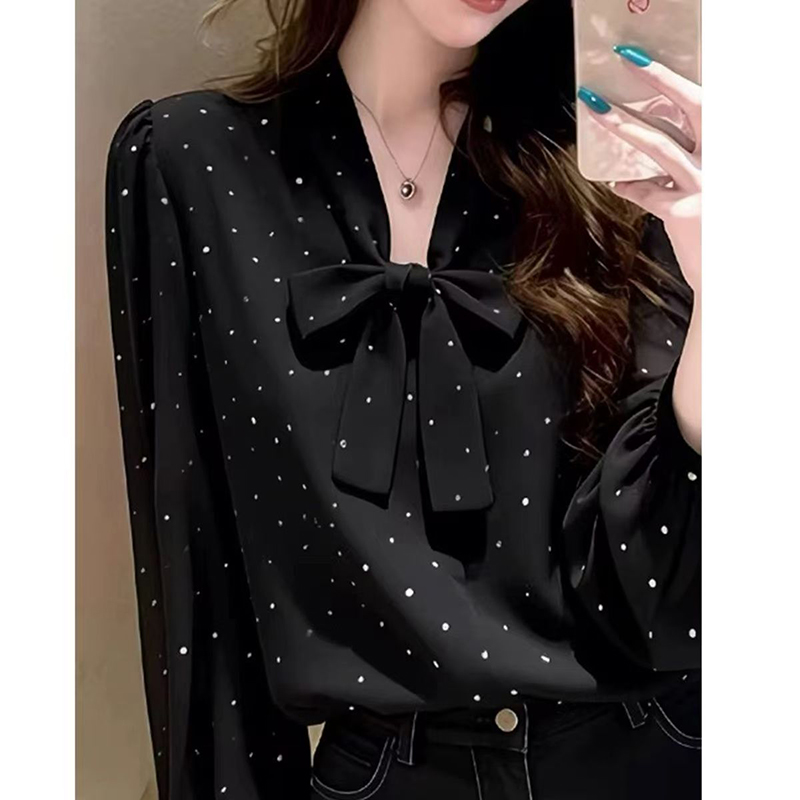 YF7138-图片色甜美新款飘带系蝴蝶结波点黑色长袖宽松大码春装雪纺衫