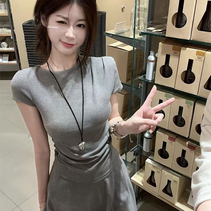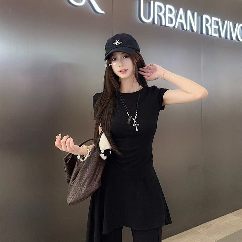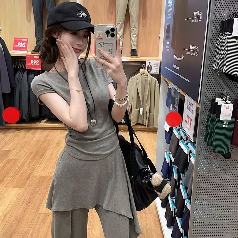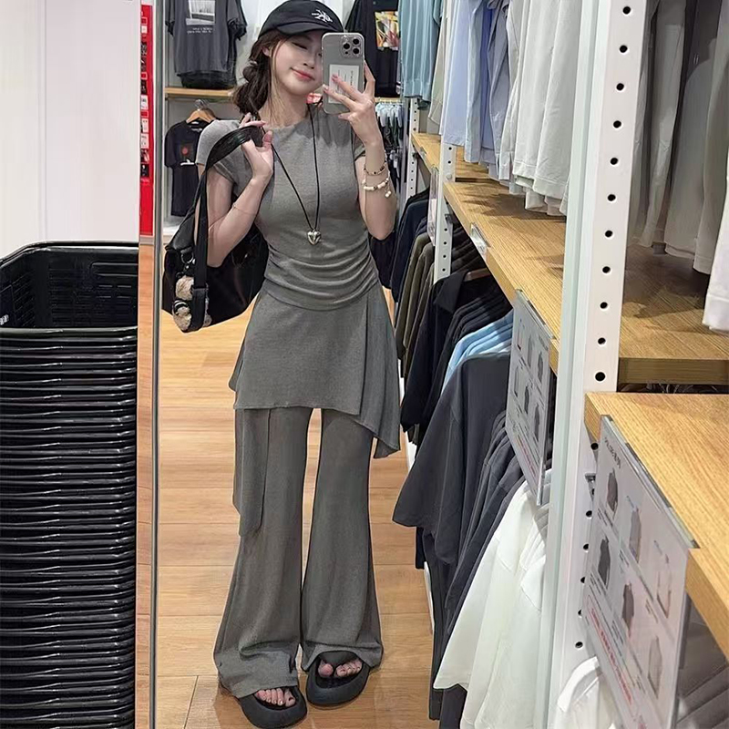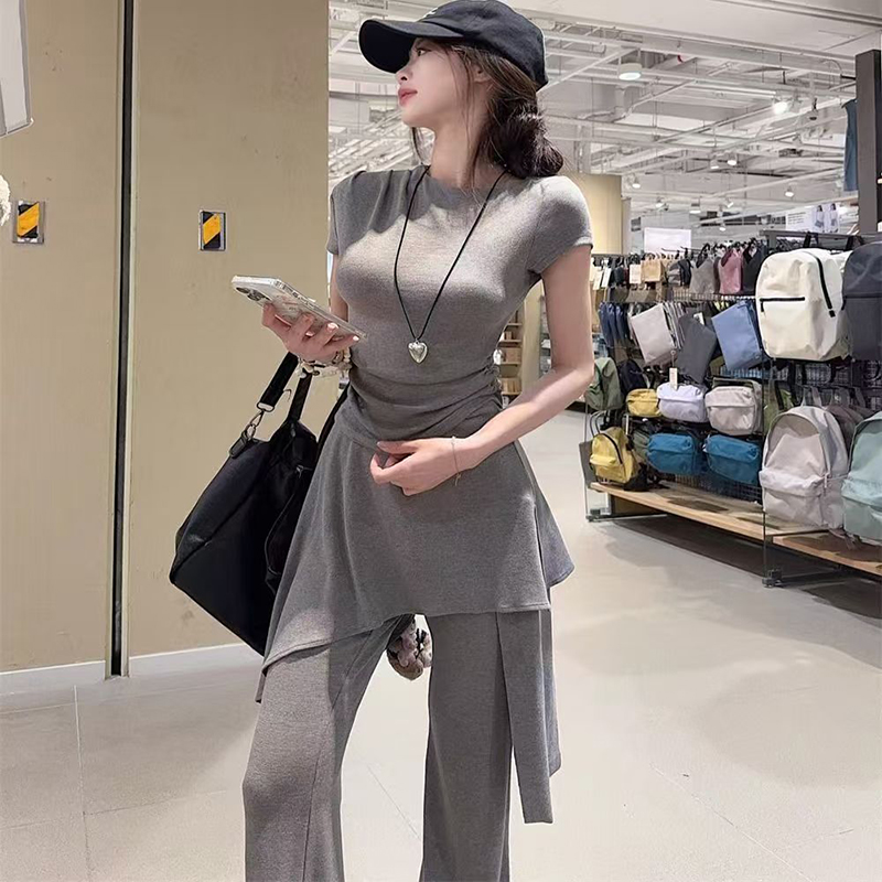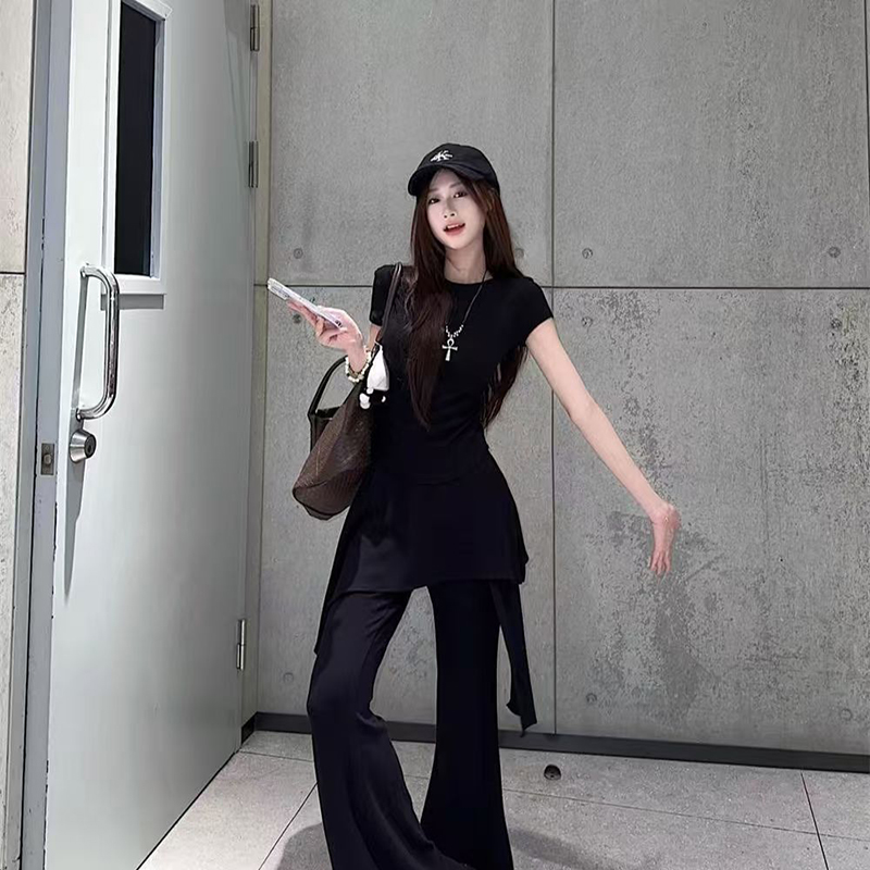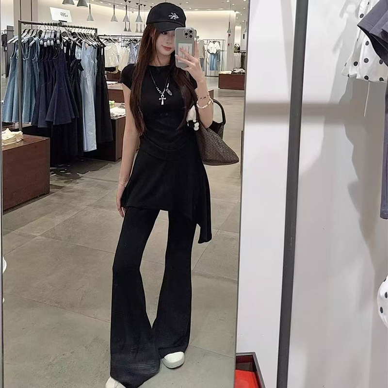 YF7149-(2色入内)两件套圆领短袖夏季弹力收身上衣搭不规则裙摆微喇叭长裤套装