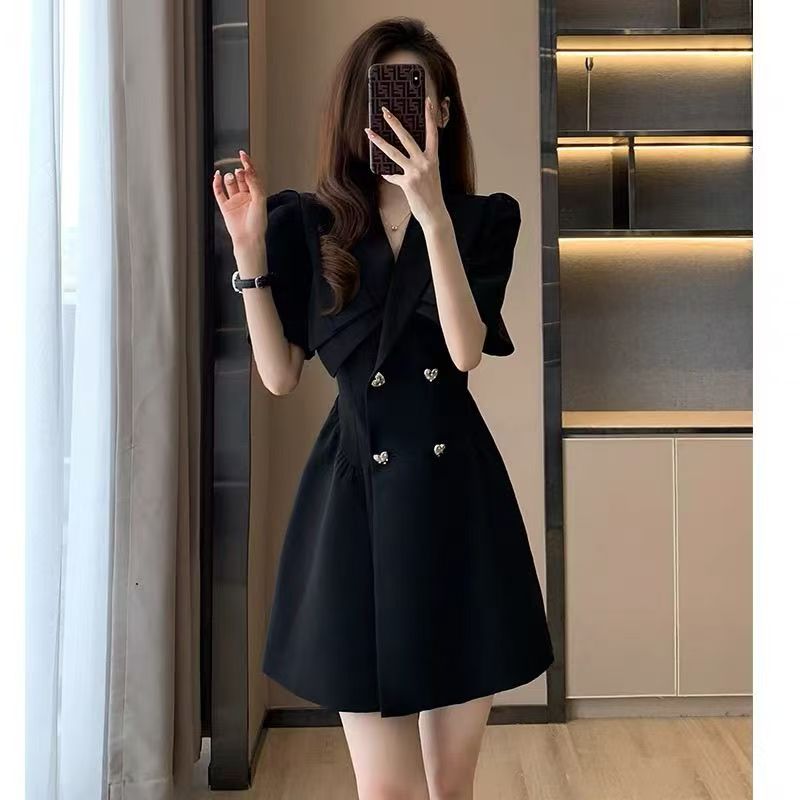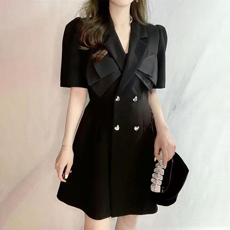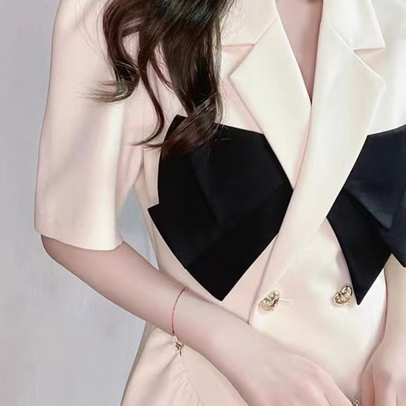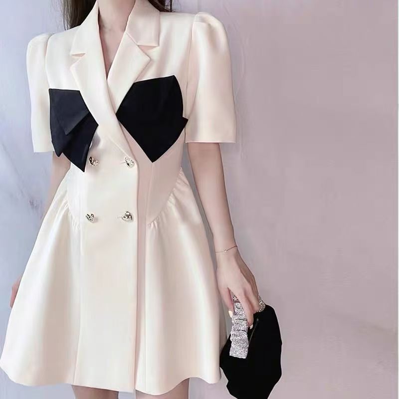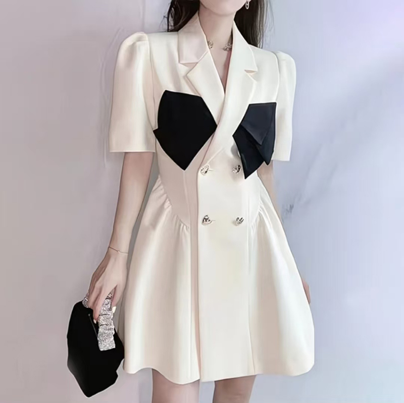 YF7153-(2色入内)假两件撞色拼接双排扣蝴蝶结夏季泡泡袖收腰显瘦西装气质连衣裙