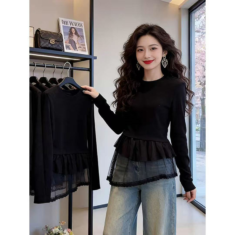 YF7156-图片色韩版春夏网纱拼接不规则设计圆领长袖宽松显瘦休闲上衣