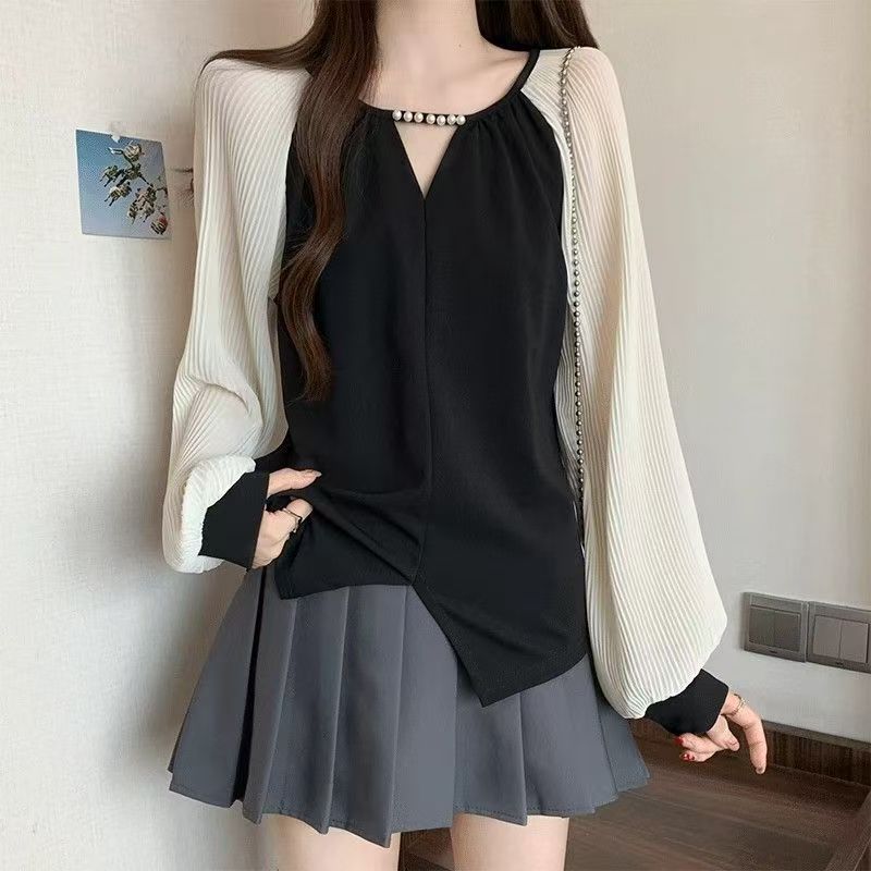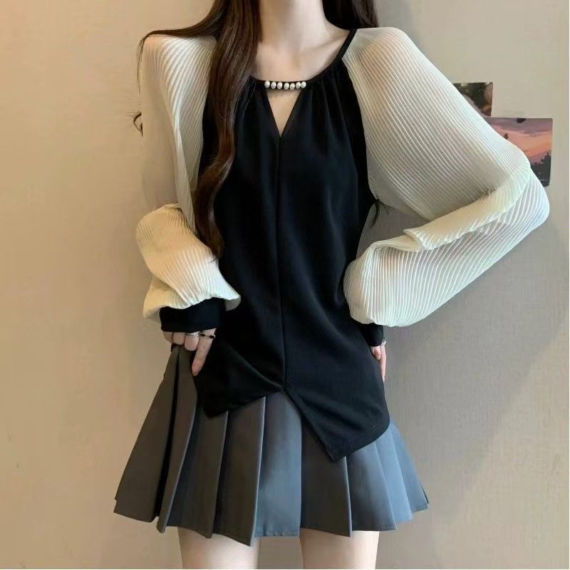 YF7156-图片色韩版春夏网纱拼接不规则设计圆领长袖宽松显瘦休闲上衣