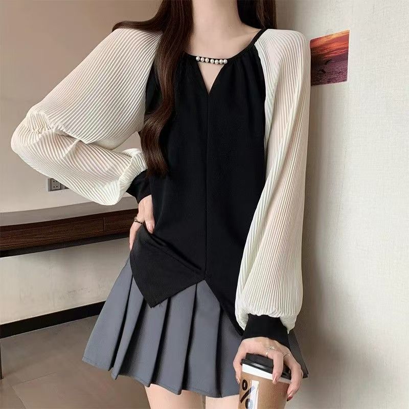 YF7157-图片色别致时尚钉珠设计泡泡袖V领二色拼接法式复古风上衣新款