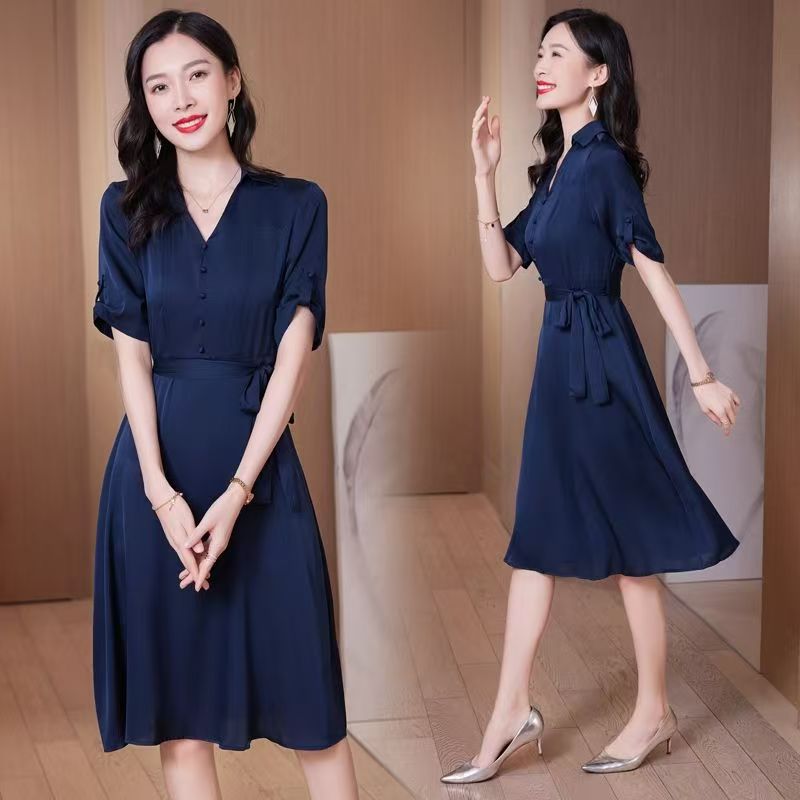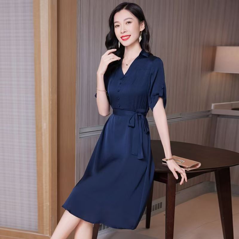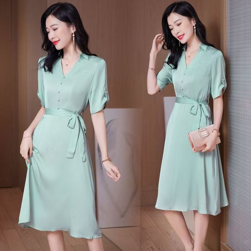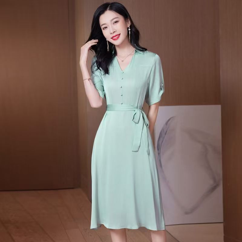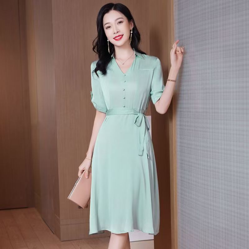 YF7162-(2色入内)新款名媛气质短袖V领收腰仿真丝柔软亲肤高级感夏季连衣裙