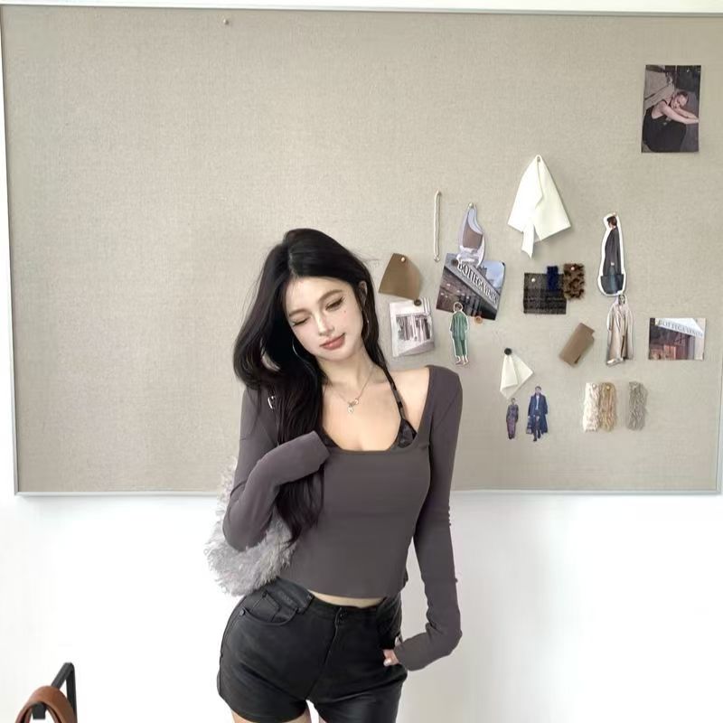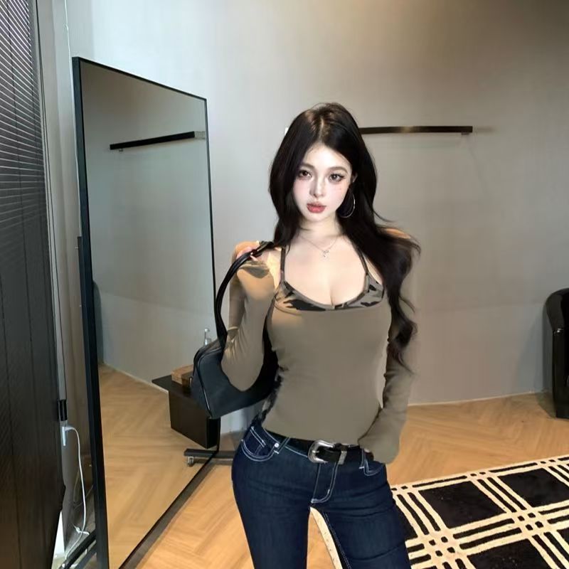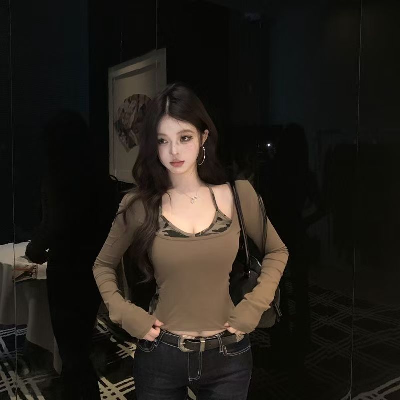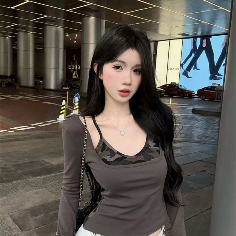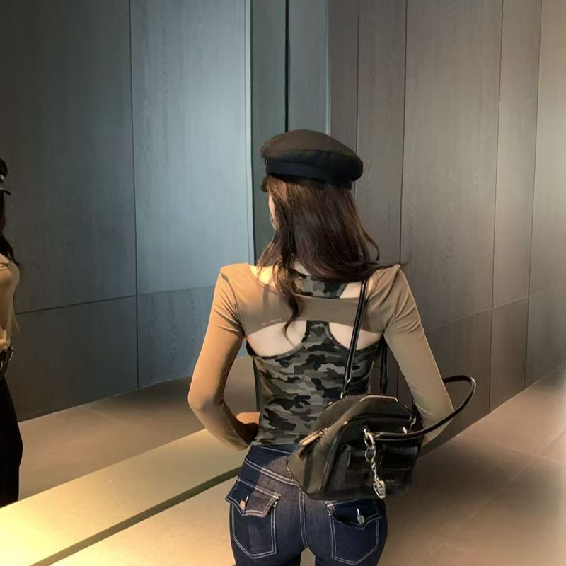 YF7163-(2色入内)假两件后背缕空迷彩拼接长袖套头设计上衣弹力修身显瘦工字背心