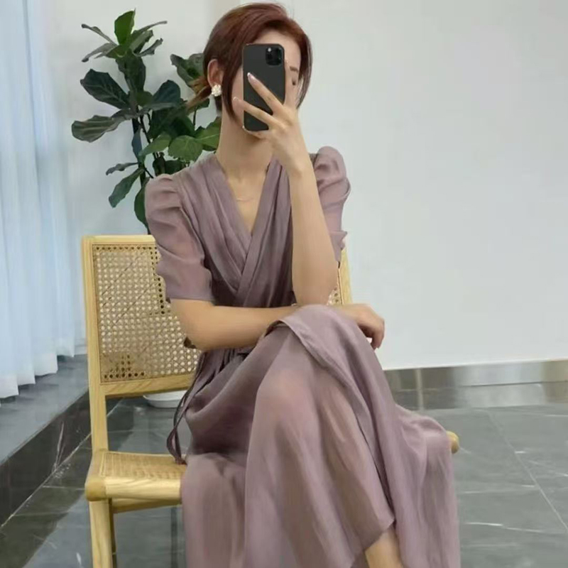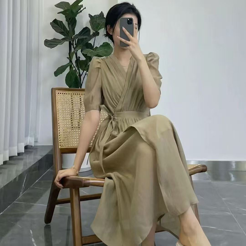 YF7164-(2色入内)夏季优雅雪纺连衣裙 短袖V领绑绳束腰法式夏季裙子