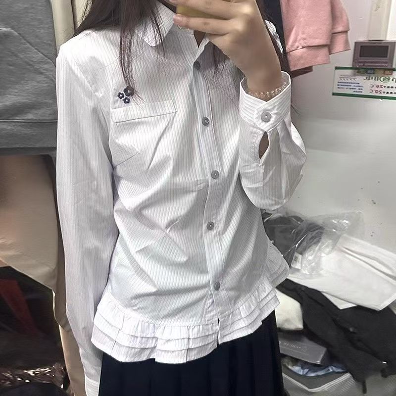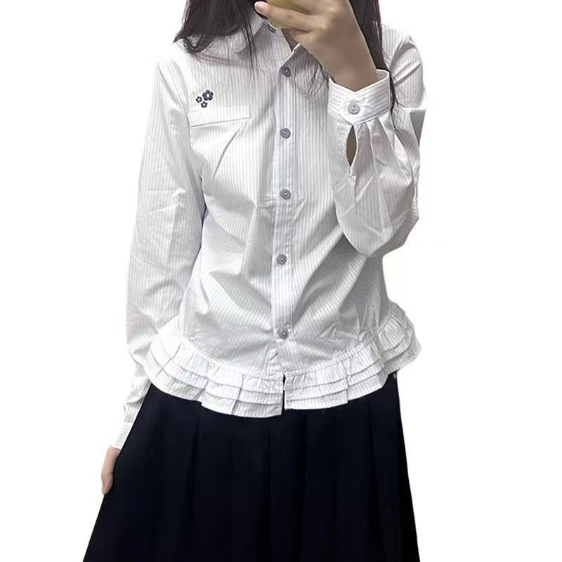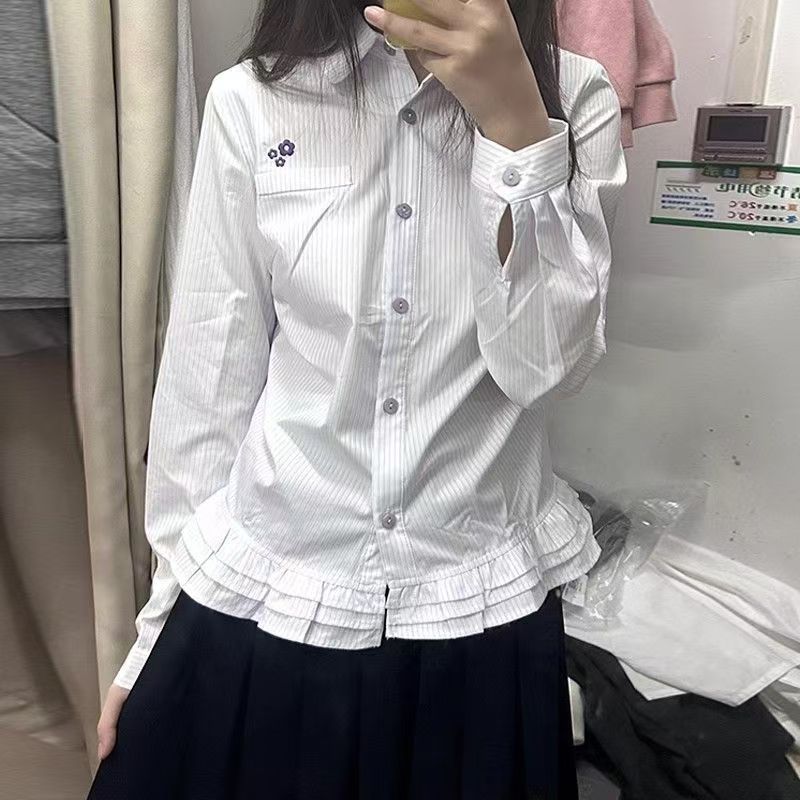 YF7165-图片色时尚个性刺绣花朵条纹长袖翻领系扣荷叶边学院风韩潮上衣