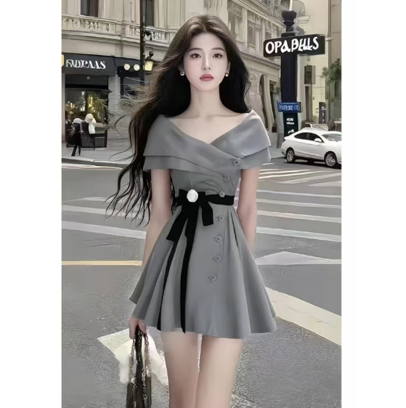 YF7175-图片色时尚精美一字肩叠式交叉V领短袖系蝴蝶结收腰素色连衣裙