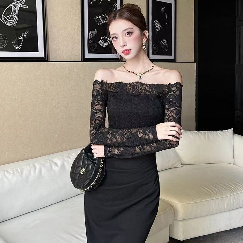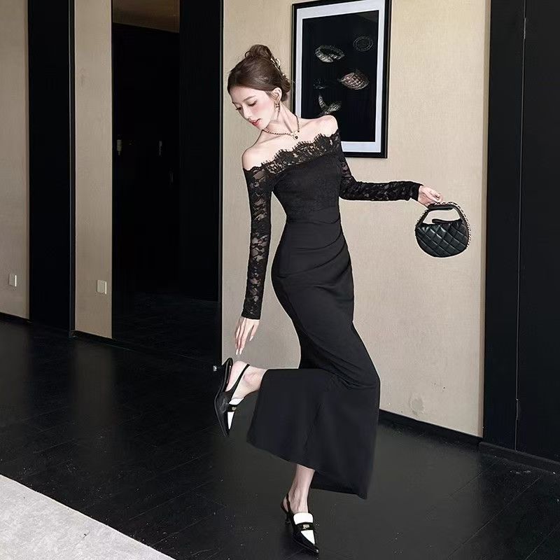 YF7178-图片色纯欲风一字肩花边抹胸弹力修腰包臀鱼尾设计蕾丝礼服