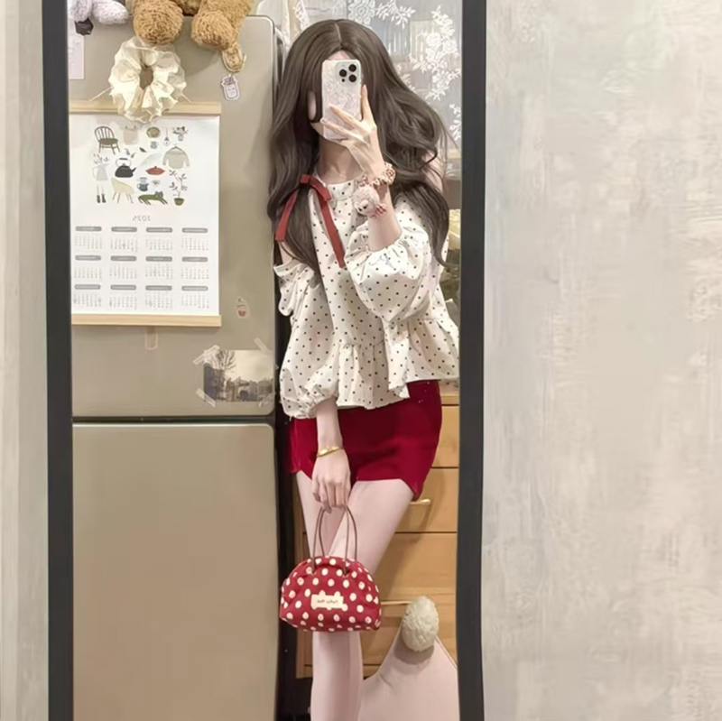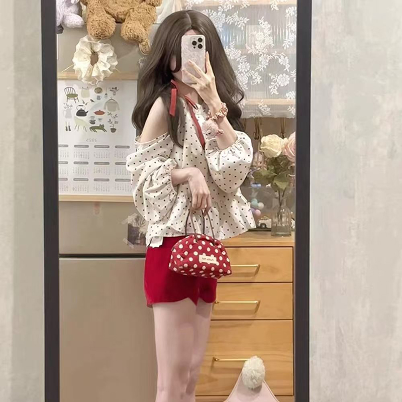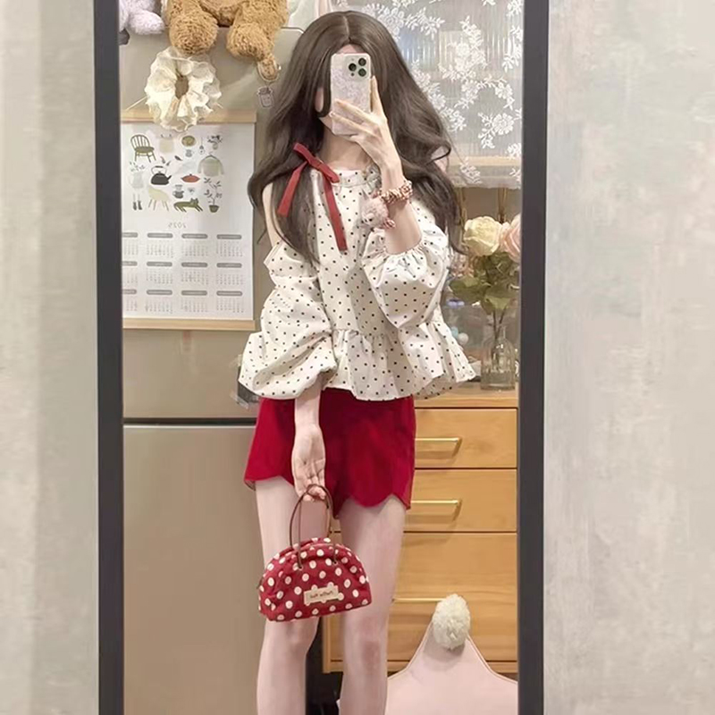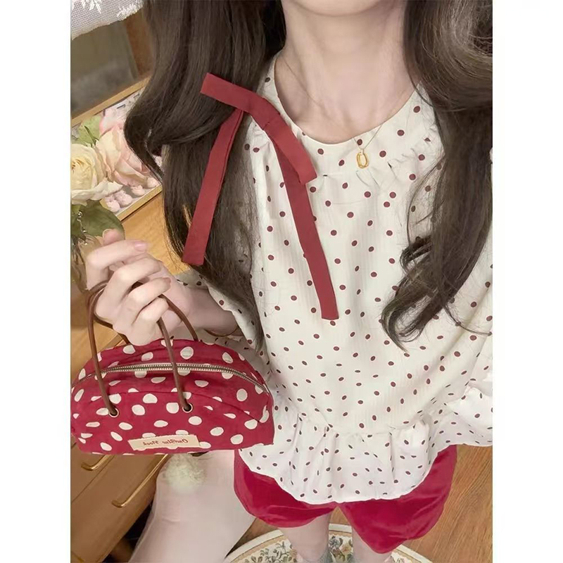 YF7181-图片色小可爱镂空泡泡袖系蝴蝶结套头宽松显瘦波点露肩设计上衣