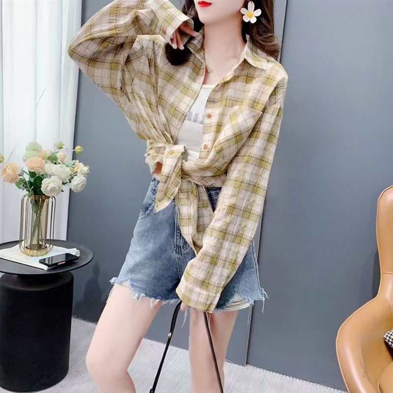 YF7184-(2色入内)复古格子衬衫韩版新款薄装长袖翻领大码慵懒风设计上衣