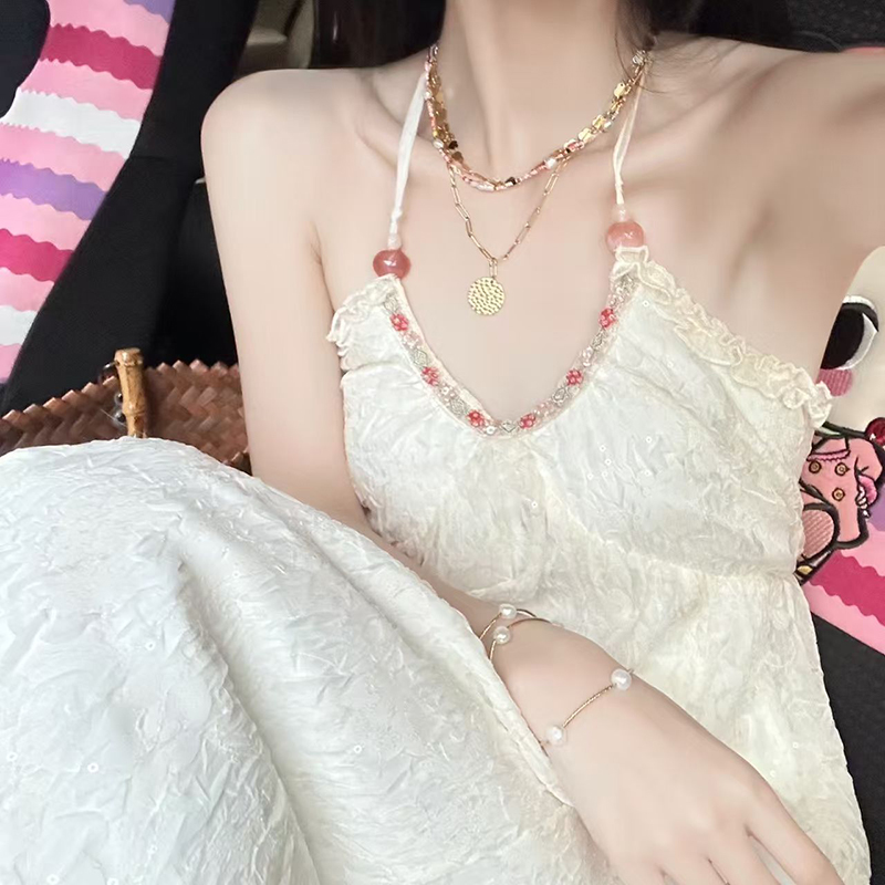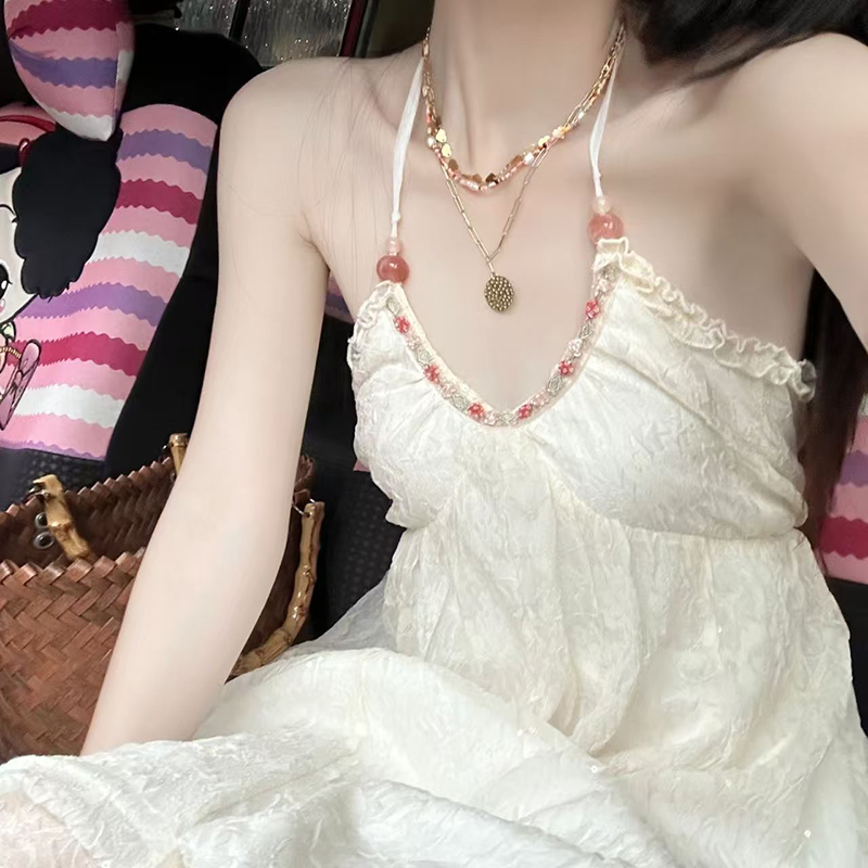 YF7185-图片色性感时尚夏季吊带大摆A字白色飘逸感度假风雪纺连衣裙