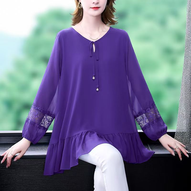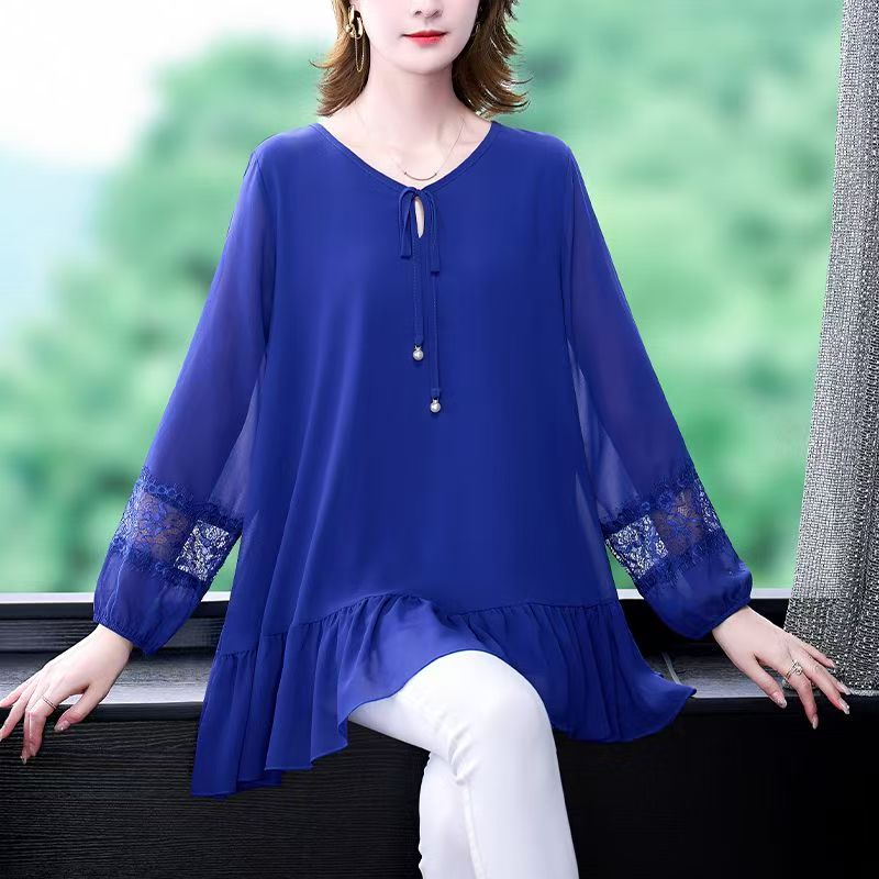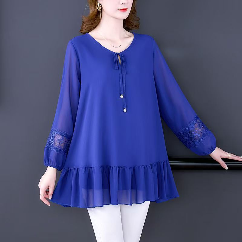 YF7186-(3色入内)时尚韩版蕾丝拼接长袖V领系蝴蝶结宽松显瘦休闲雪纺衫