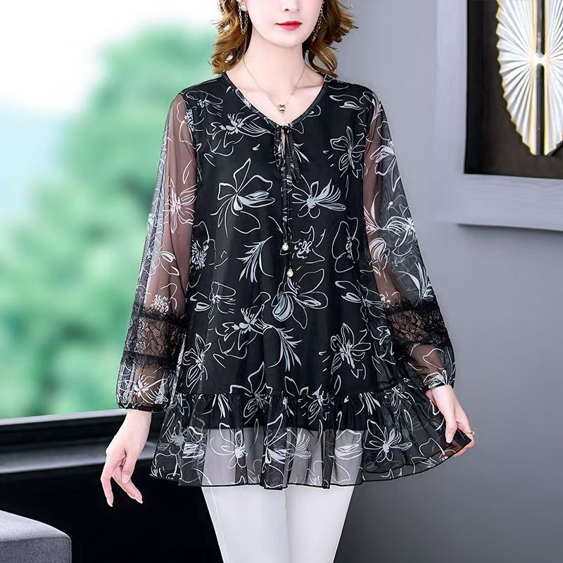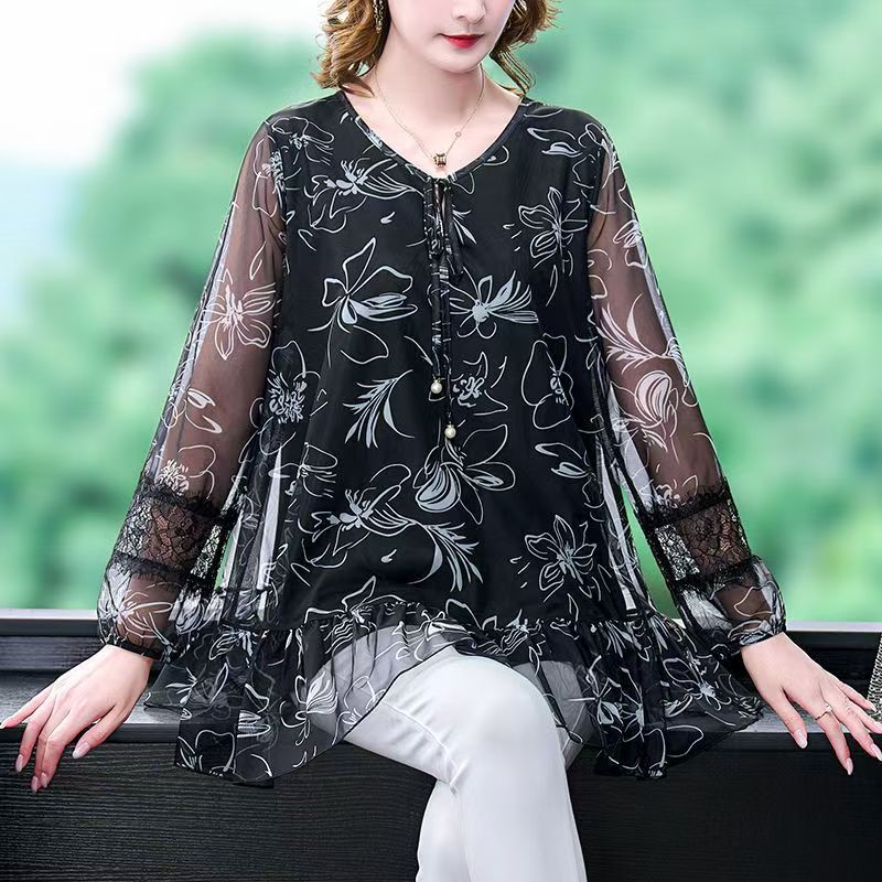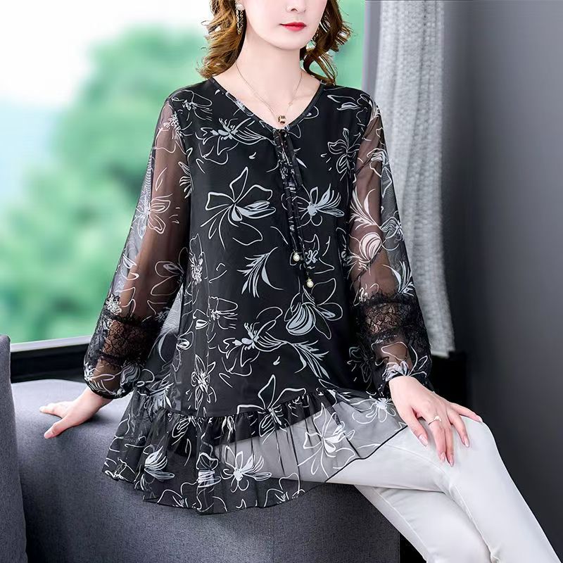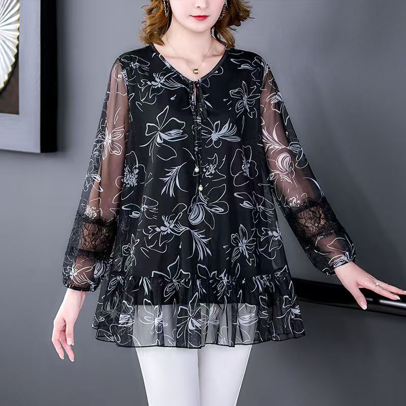 YF7187-图片色优雅时尚透视袖V领洋气碎花印花胖MM显瘦大码雪纺上衣