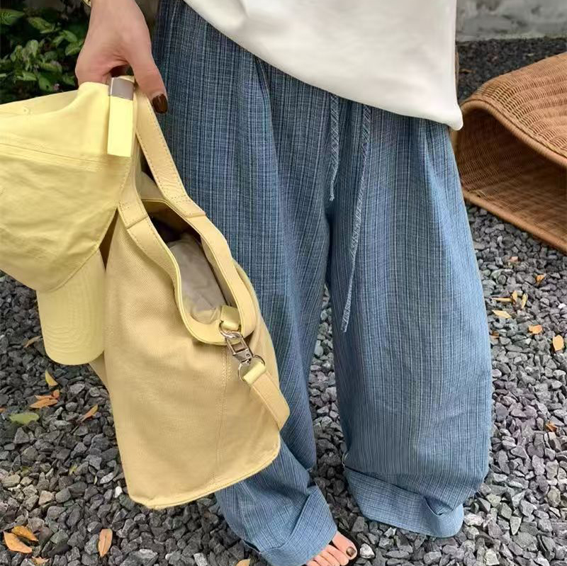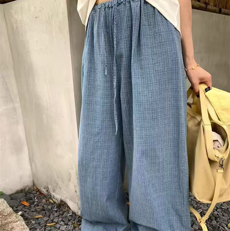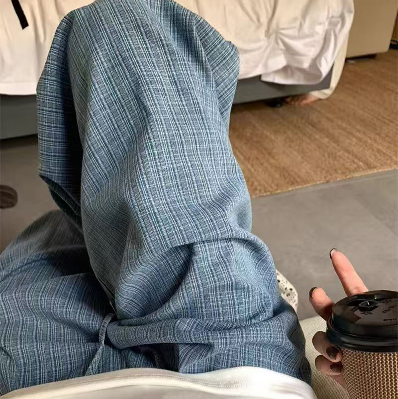 YF7193-图片色港式薄款抽绳松紧腰直筒坠地感复古格子纹慵懒风大码休闲裤
