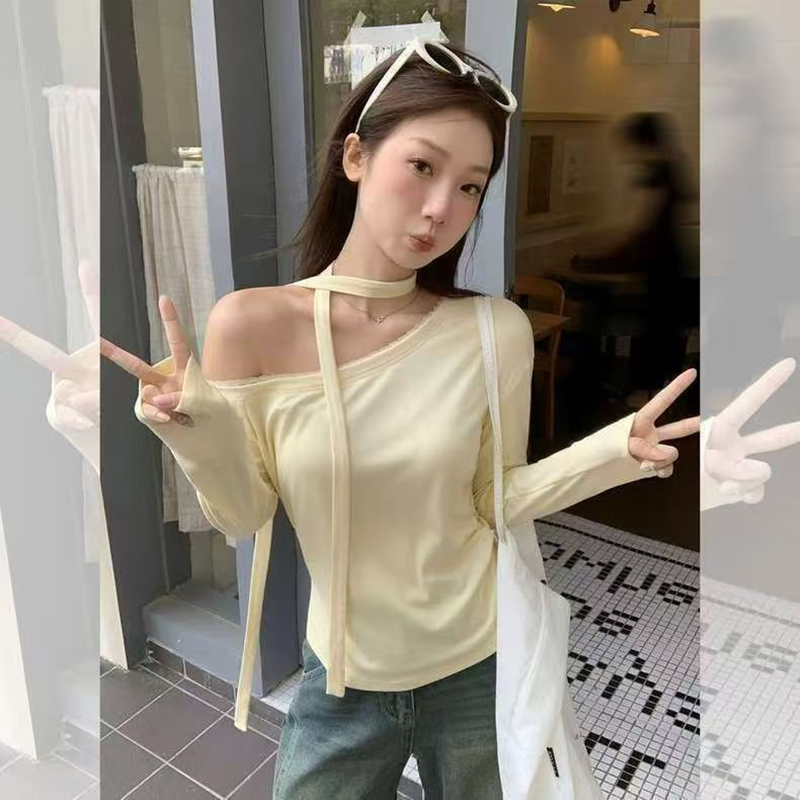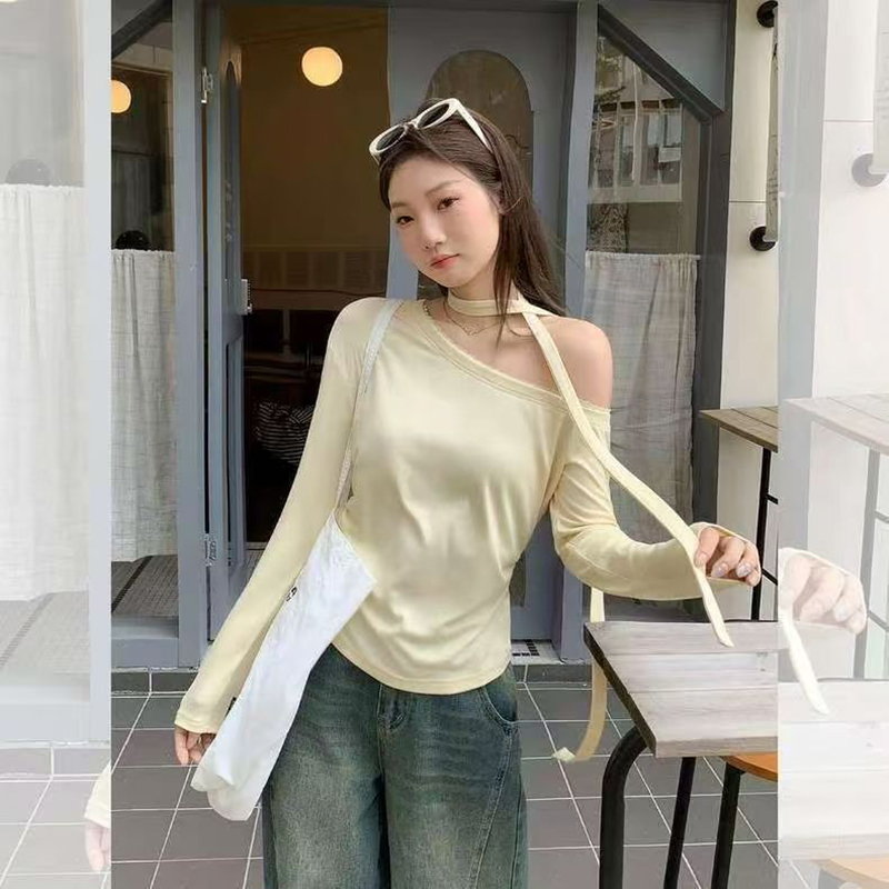 YF7201-图片色纯欲风露单肩设计感长袖围脖飘带宽松显瘦韩版新款T恤