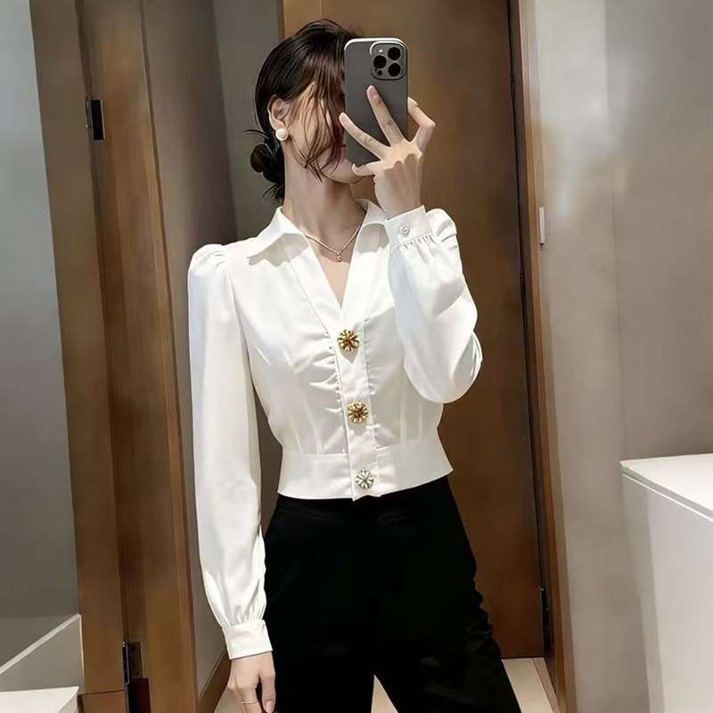 YF7210-图片色高级感泡泡袖翻领个性纽扣拼接修腰短装白色法式气质上衣